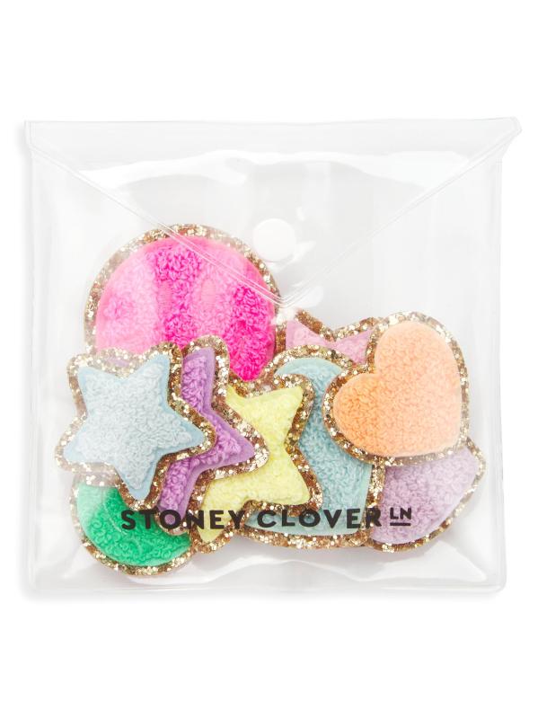 تتميز رقع الأيقونات اللامعة من Stoney Clover Lane بزخرفة مصنوعة من قماش الشنيل مع لمسات لامعة.