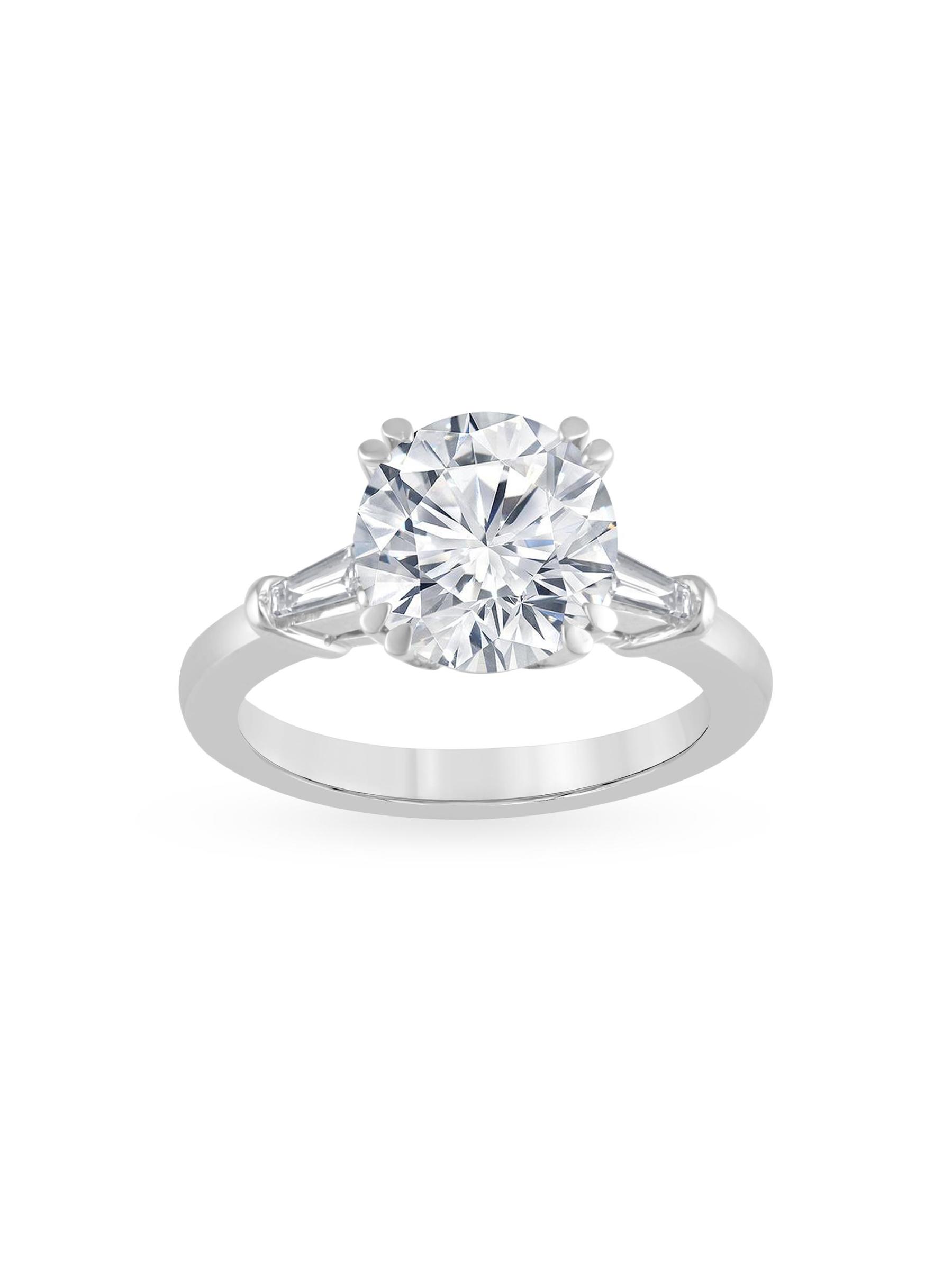 تم تصميم خاتم سوليتير من الذهب الأبيض عيار 14 قيراطًا من Saks Fifth Avenue من الماس المبهر المزروع في المختبر، وقد تم تمييزه بحجرين مقطوعين من الباجيت على السوار.