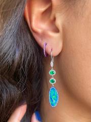 تتميّز أقراط «ميرا تي» المصنوعة من الذهب الأبيض عيار 14 قيراطًا والمرصّع بطلاء الروديوم الأزرق، بقطرات من العقيق والزمرد النابضة بالحياة تحدها أحجار الماس المرصوفة المتلألئة.