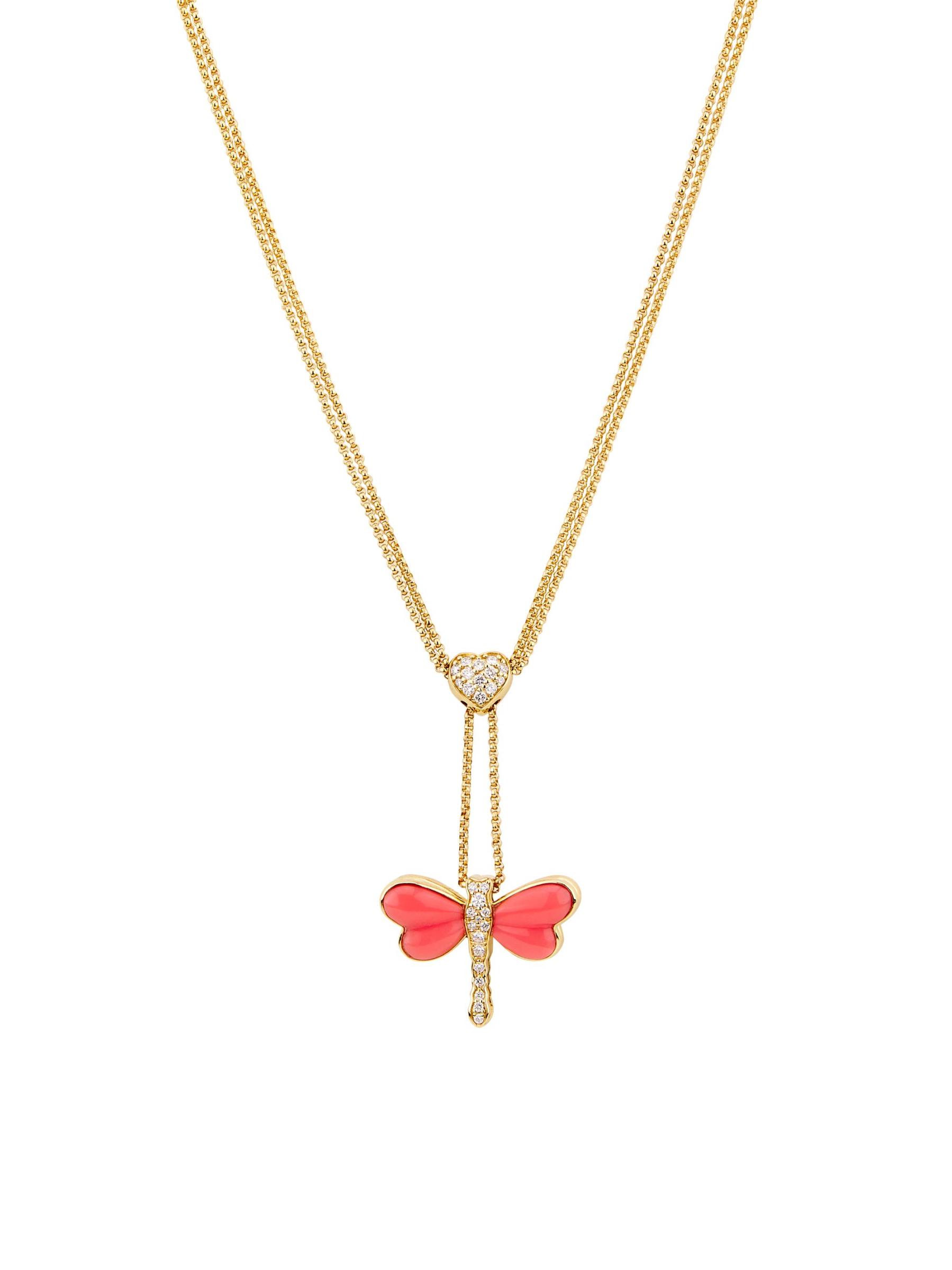 قلادة لاريا هذه من نينا جيلين مصنوعة من الذهب الأصفر عيار 14 قيراطًا وتتميز بزخارف القلب واليعسوب المزينة بالألماس اللامع والمينا اللامعة.