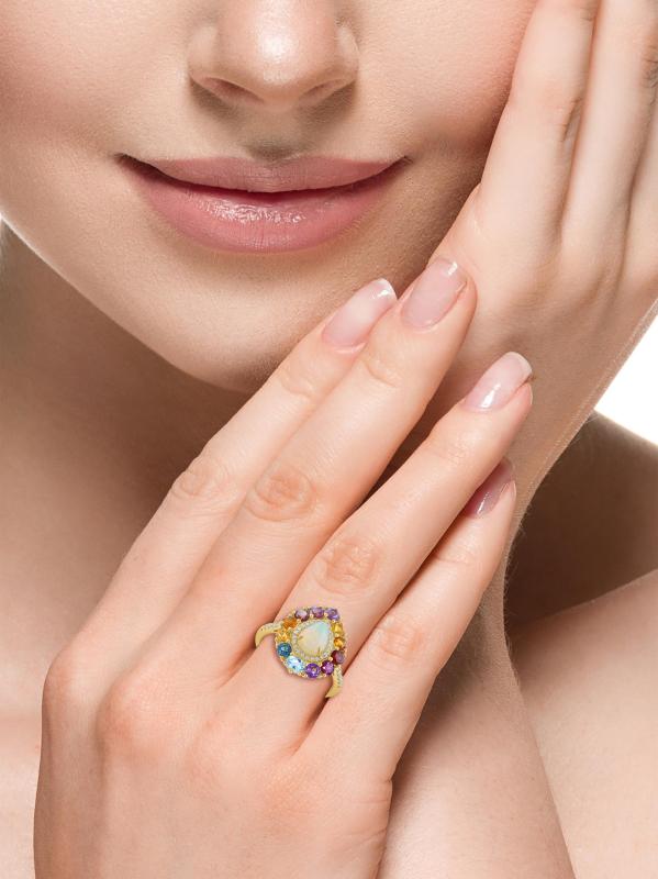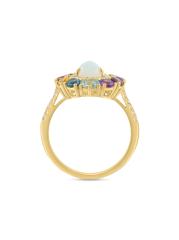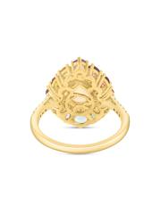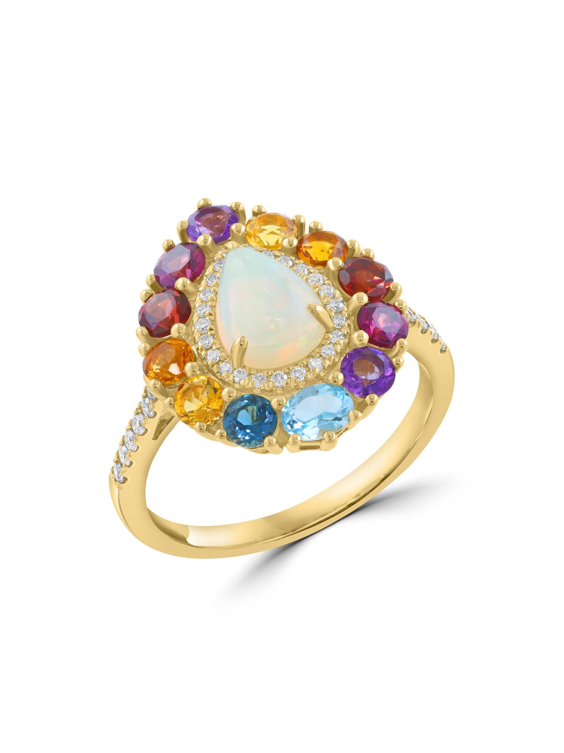 صُنع خاتم الهالة هذا من الذهب الأصفر عيار 14 قيراطًا من مجموعة ساكس فيفث أفينيو، ويتميز بأوبل إثيوبي مضيء على شكل كمثرى تحده الأحجار الكريمة المختلطة النابضة بالحياة والماس المرصوف.