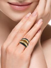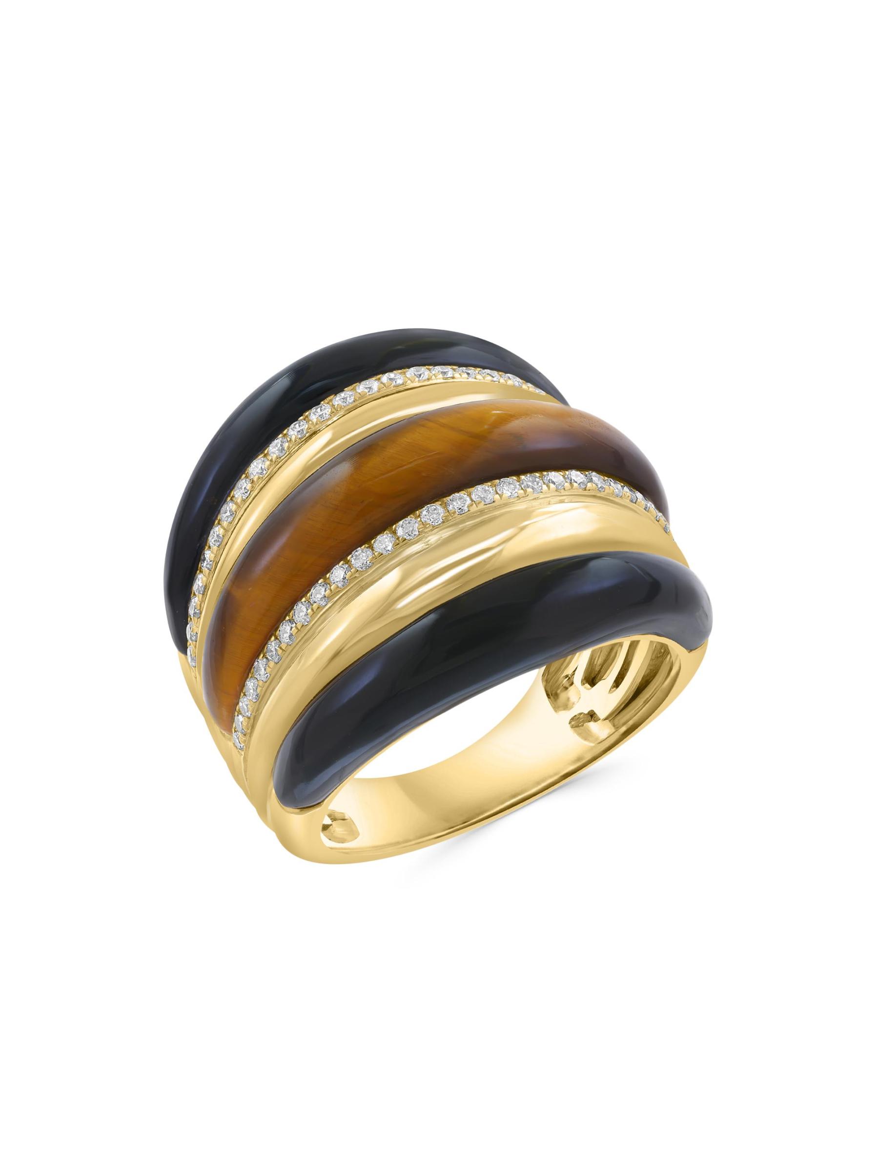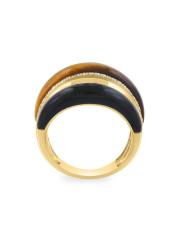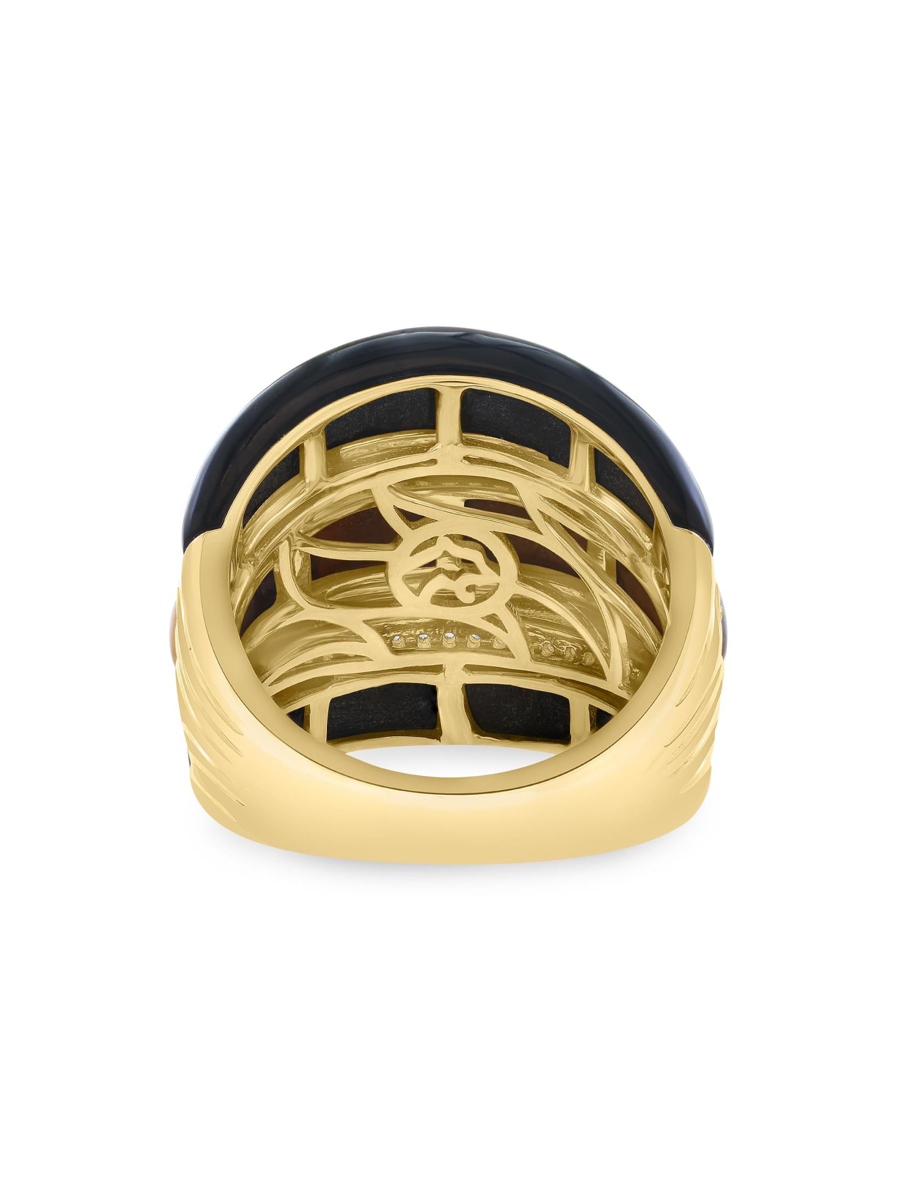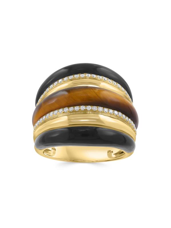 صُنع هذا الخاتم من الذهب الأصفر عيار 14 قيراطًا من مجموعة ساكس فيفث أفينيو، وهو مزين بأشرطة من عين النمر والعقيق الأسود والماس المرصوف اللامع.