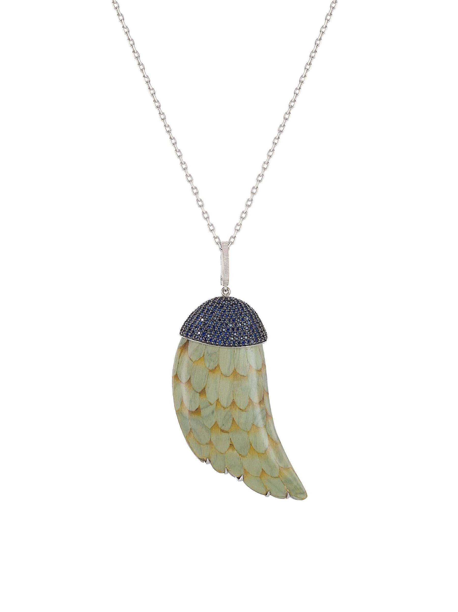 صُنعت هذه القلادة من الذهب الأبيض عيار 18 قيراطًا، وتتميز بقلادة خشبية مرسومة يدويًا بالريش ومزينة بالياقوت الأزرق اللامع. هذه القطعة الرائعة هي جزء من مجموعة Marquetry لسيلفيا فورمانوفيتش، وهي مجموعة تجمع بين ألوان وملمس الخشب الأصلي الذي تم إنقاذه مع الأحجار الكريمة والمعادن الثمينة لإنشاء مجوهرات فريدة من نوعها.