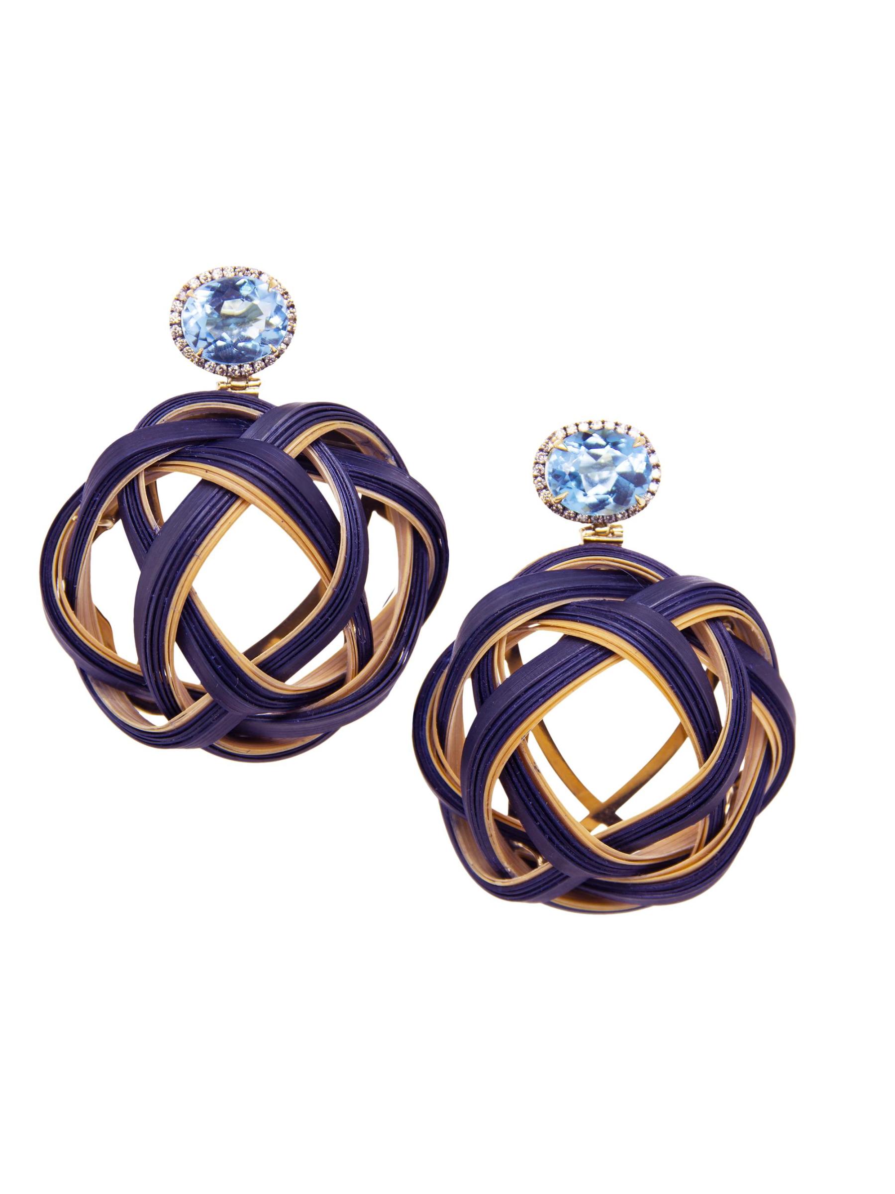 أقراط متدلية من الذهب الأصفر عيار 18 قيراطًا والتوباز الأزرق والماس والخيزران