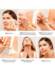 بعد تنظيف الجلد، قم بهز الأمبولة وتغطية عنق الأمبولة بفتاحة الأمبولة المغلقة أو بمنديل تجميلي. أمسك الأمبولة من عنق الأمبولة أو الفتحة وافتحها عند الحلقة السوداء بكبسة سريعة. ثم وزعي السيروم المركز في راحتي اليدين. ضعي محتويات الأمبولة بالكامل على الوجه والرقبة والصدر، مع الضغط الخفيف بأطراف الأصابع.