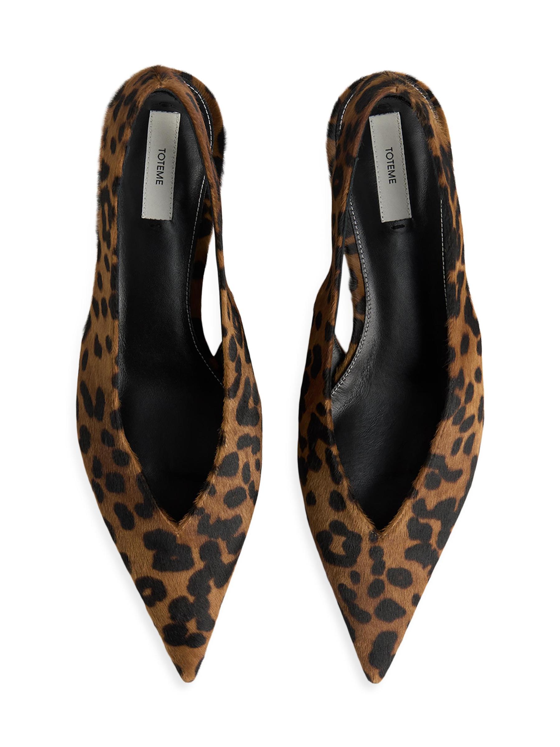 تتميّز أحذية سلينغ باك هذه من Toteme، المصنوعة من شعر المهر المصقول بنقشة جلد الفهد، بكعب منحوت على شكل قطة صغيرة مع تصميم إسفين مدبب مميّز. يُكمل إصبع القدم المدبب ذو الحافة المنخفضة الصورة الظلية.