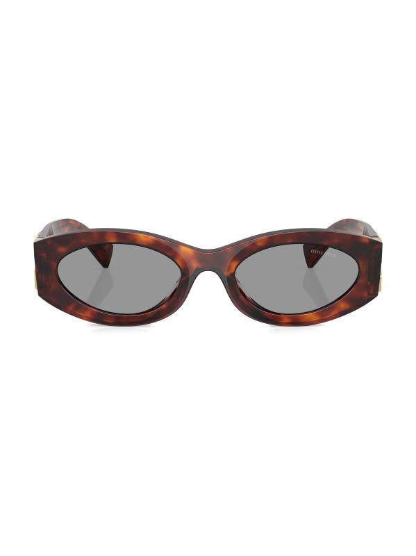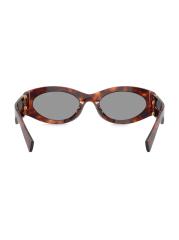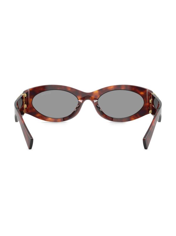 تتميز النظارات الشمسية من Miu Miu بتصميم بيضاوي جريء يجمع بين الدراما والرقي. يُضفي الشعار ذو الحجم الكبير والشكل المنخفض مظهرًا رائعًا ومؤثرًا، حيث يعمل الشعار أيضًا كمفصل على الصدغين.