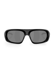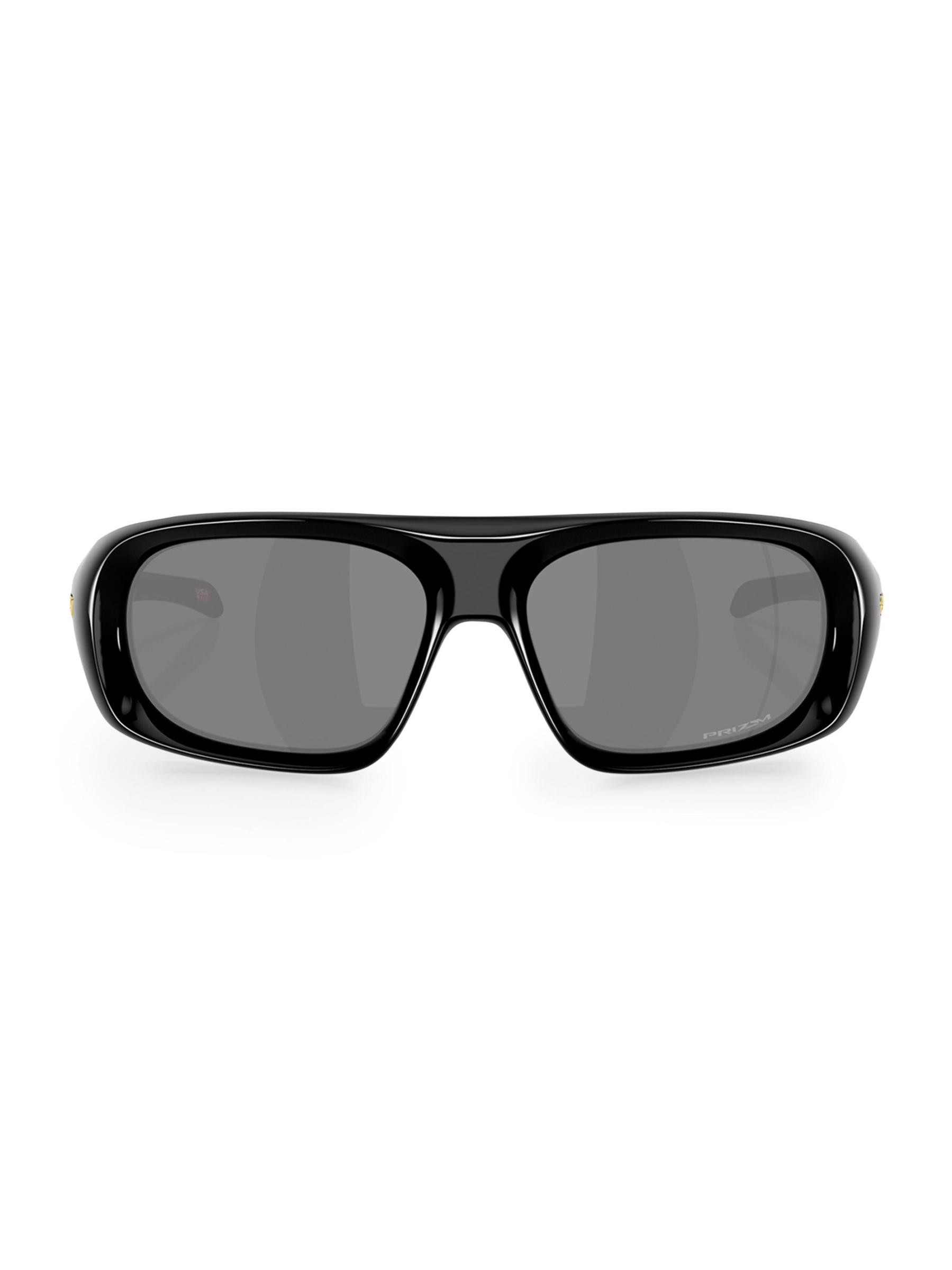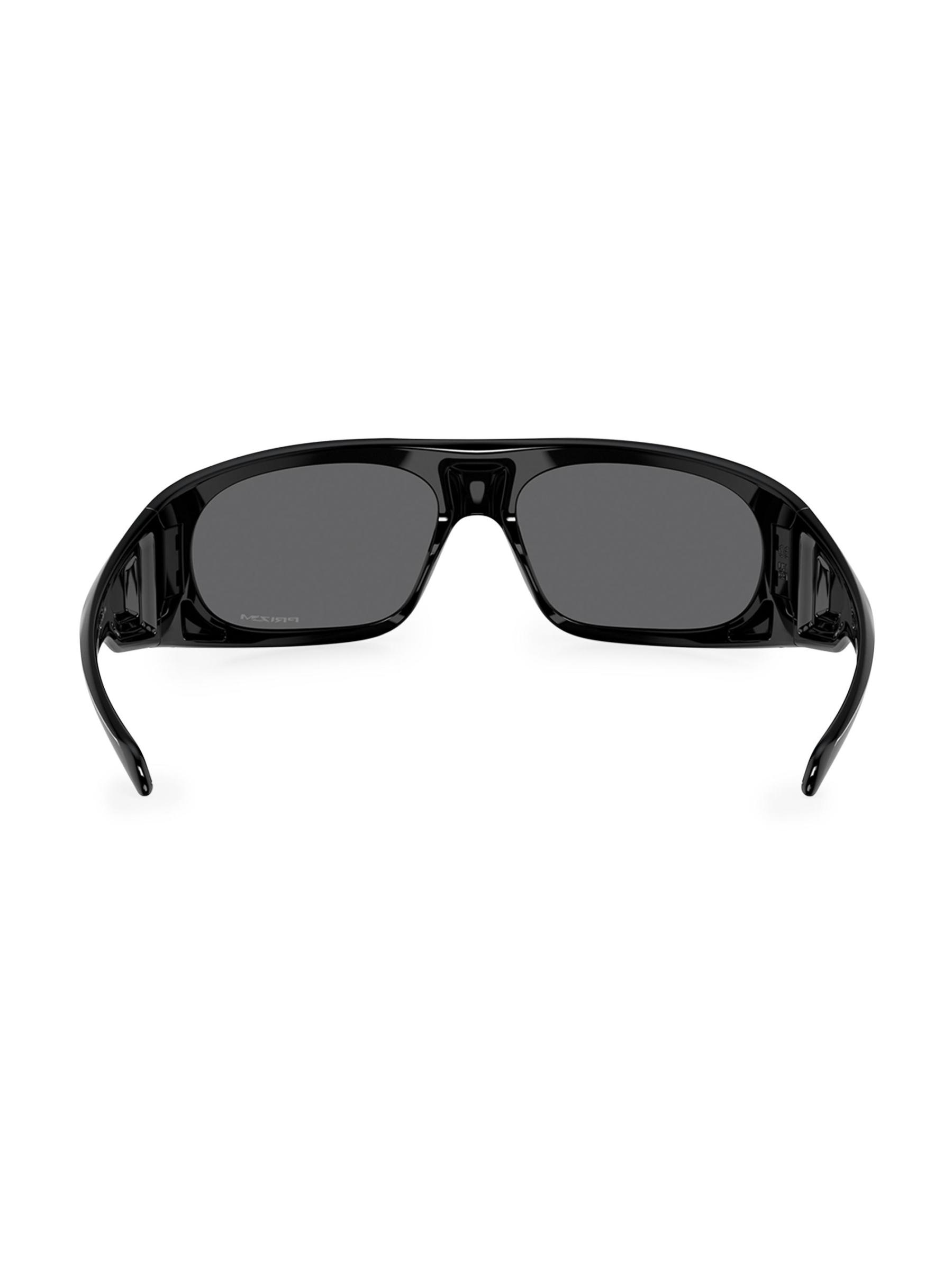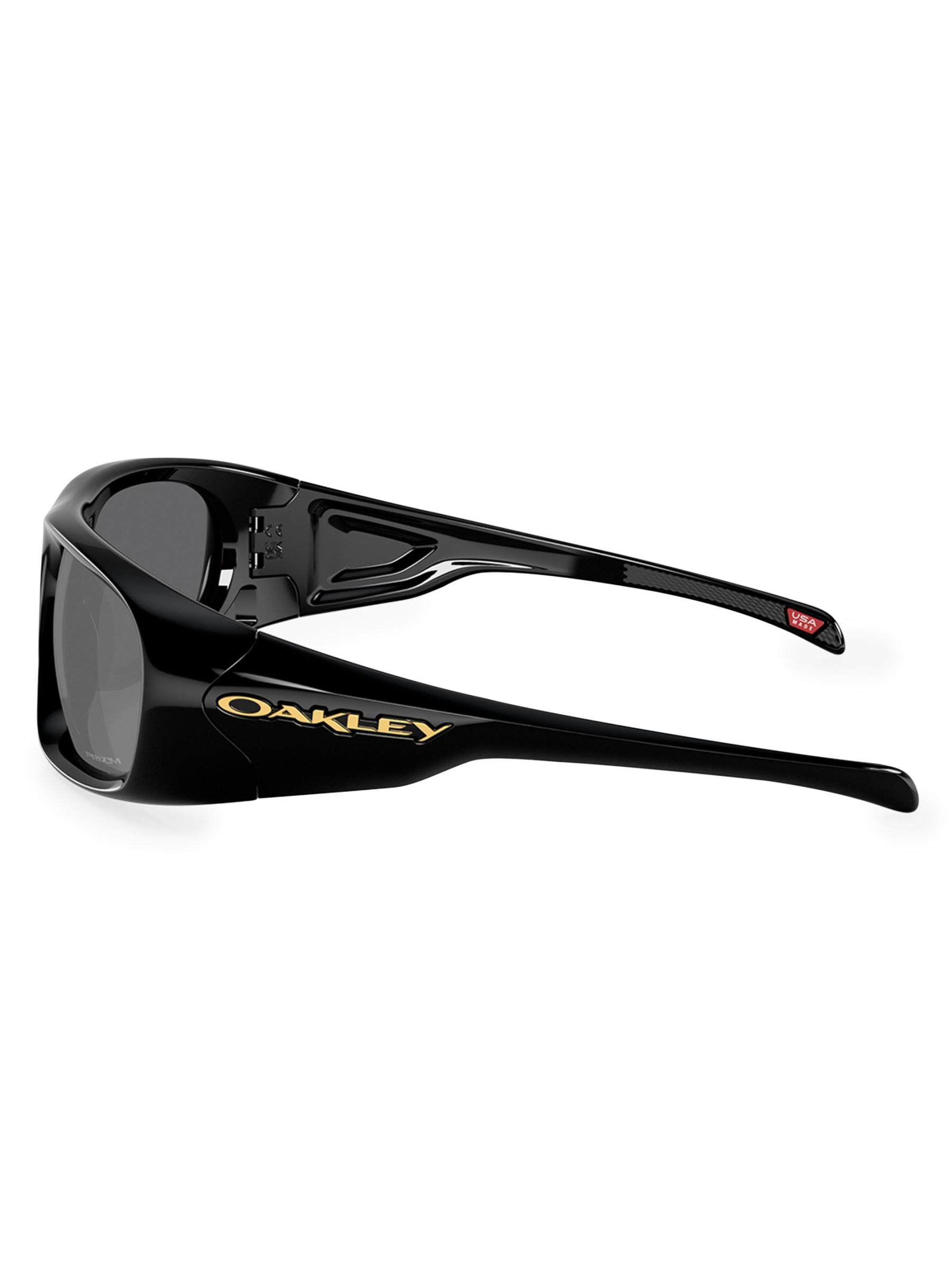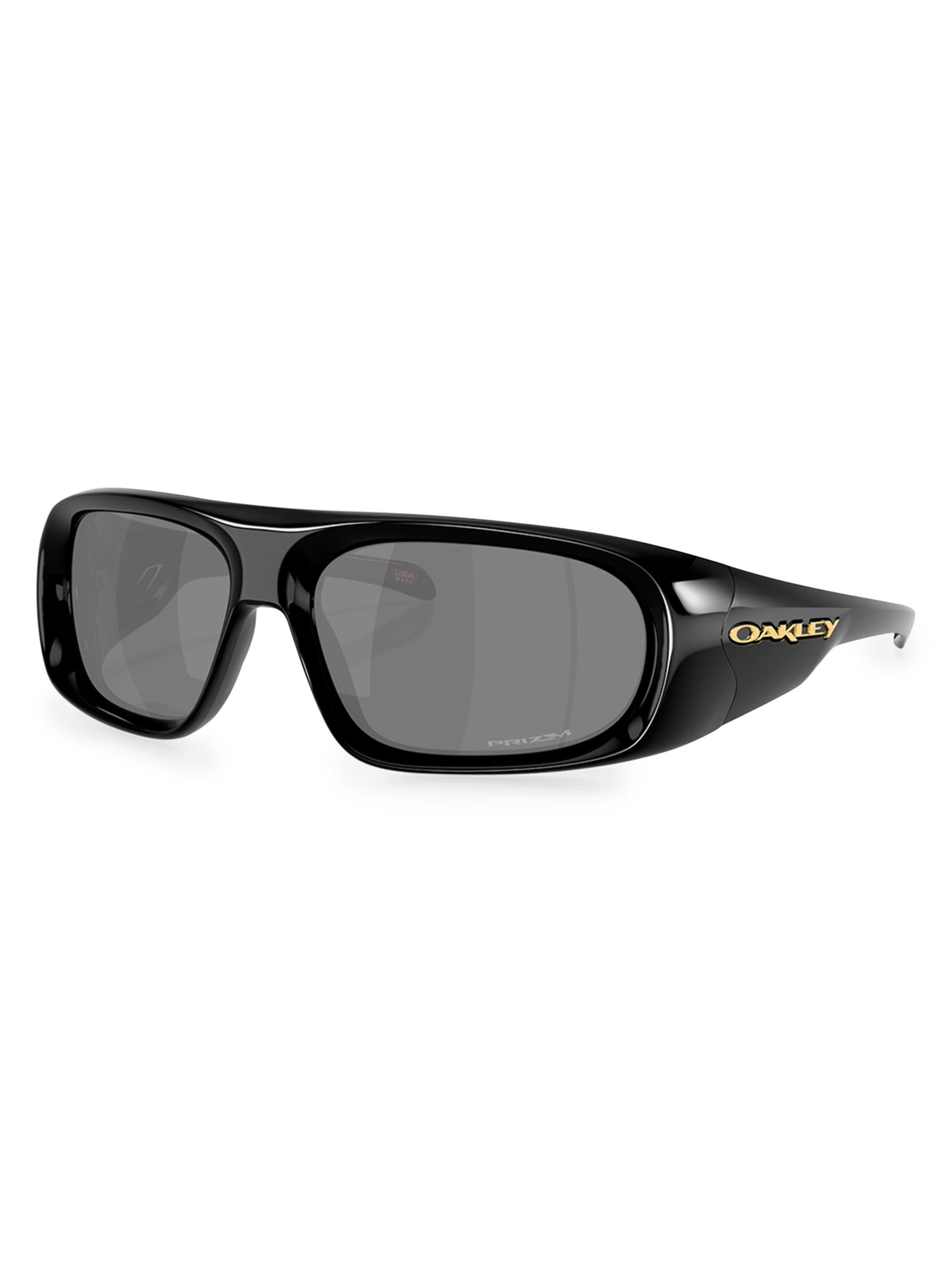 تم تصميم نظارات Oakley الشمسية هذه على شكل مستطيل وتتميز بحروف الشعار على الصدغين وجسر أنف على شكل سرج.