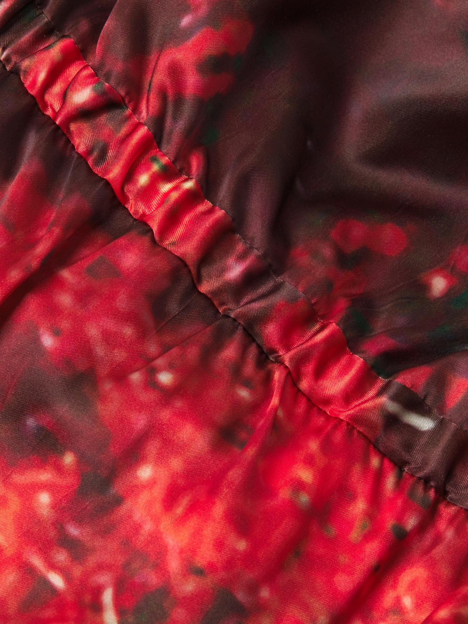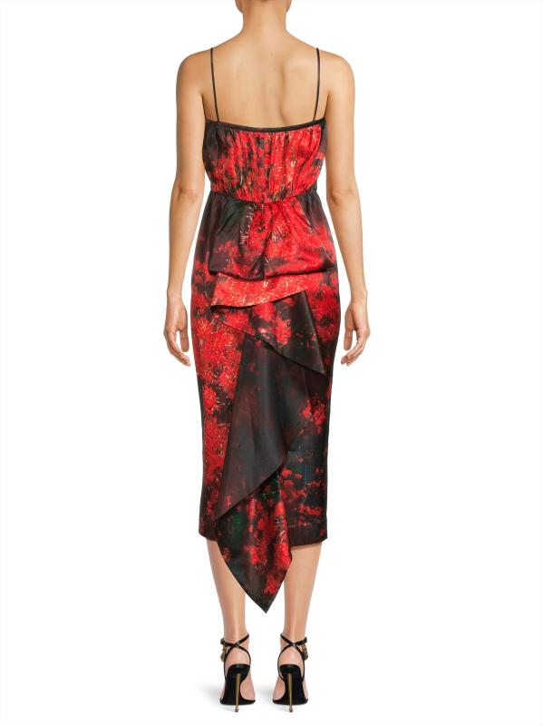 يتميز هذا الفستان المتوسط من Hope for Flowers بطبعة تجريدية وأشرطة سباغيتي وتفاصيل منسدلة مكشكشة متتالية في الخلف.