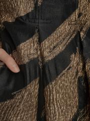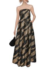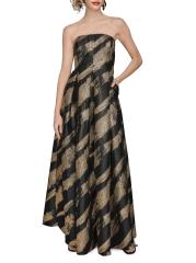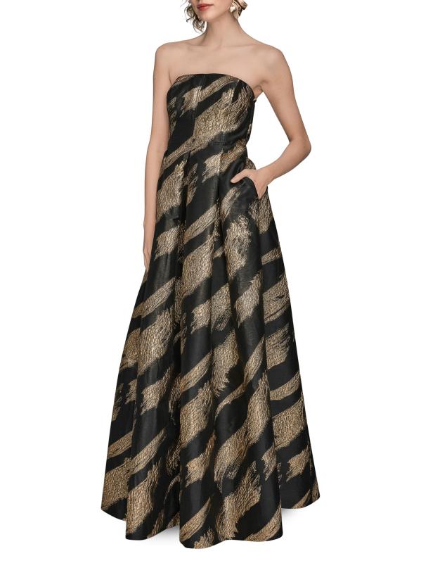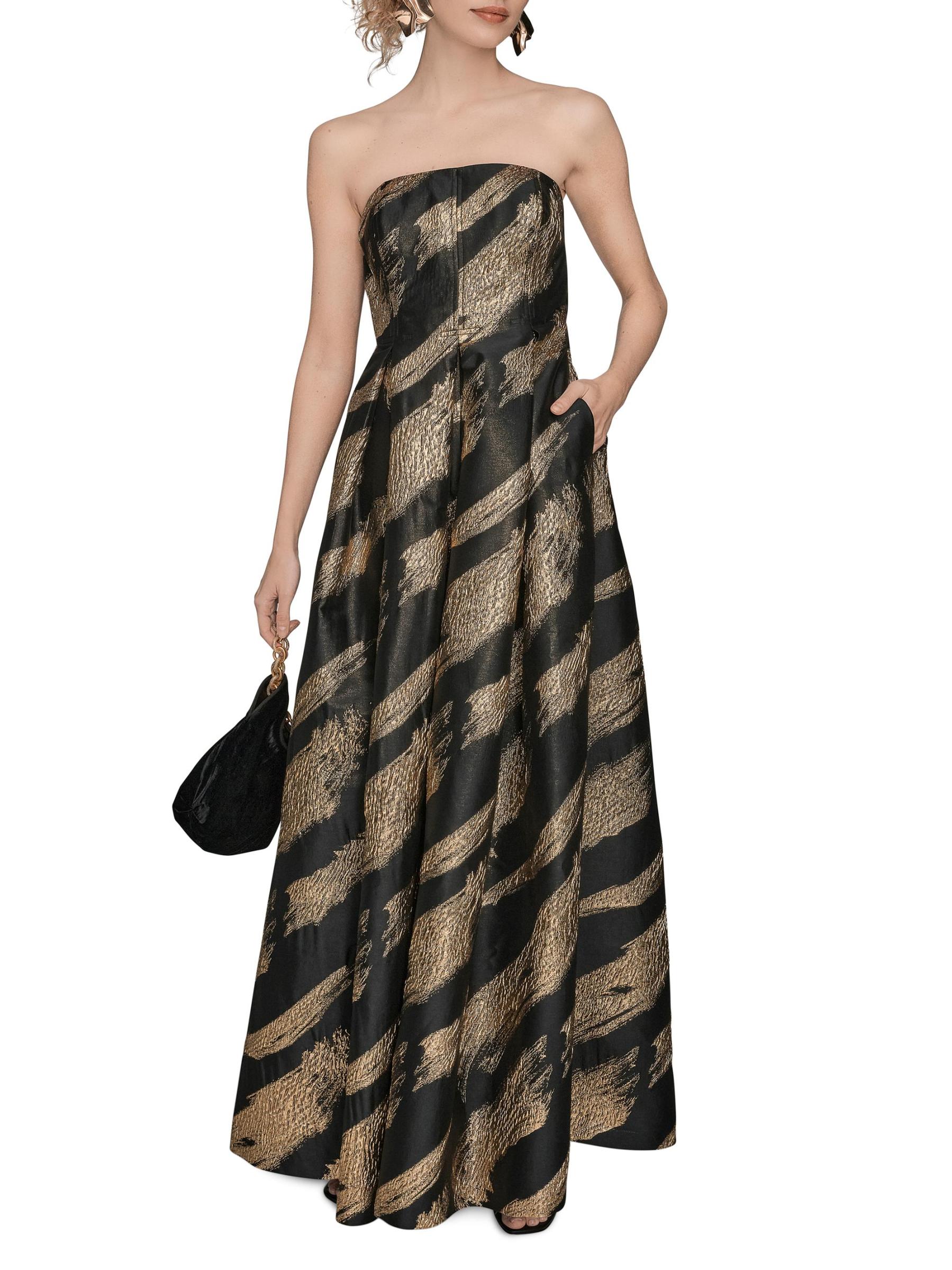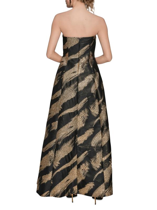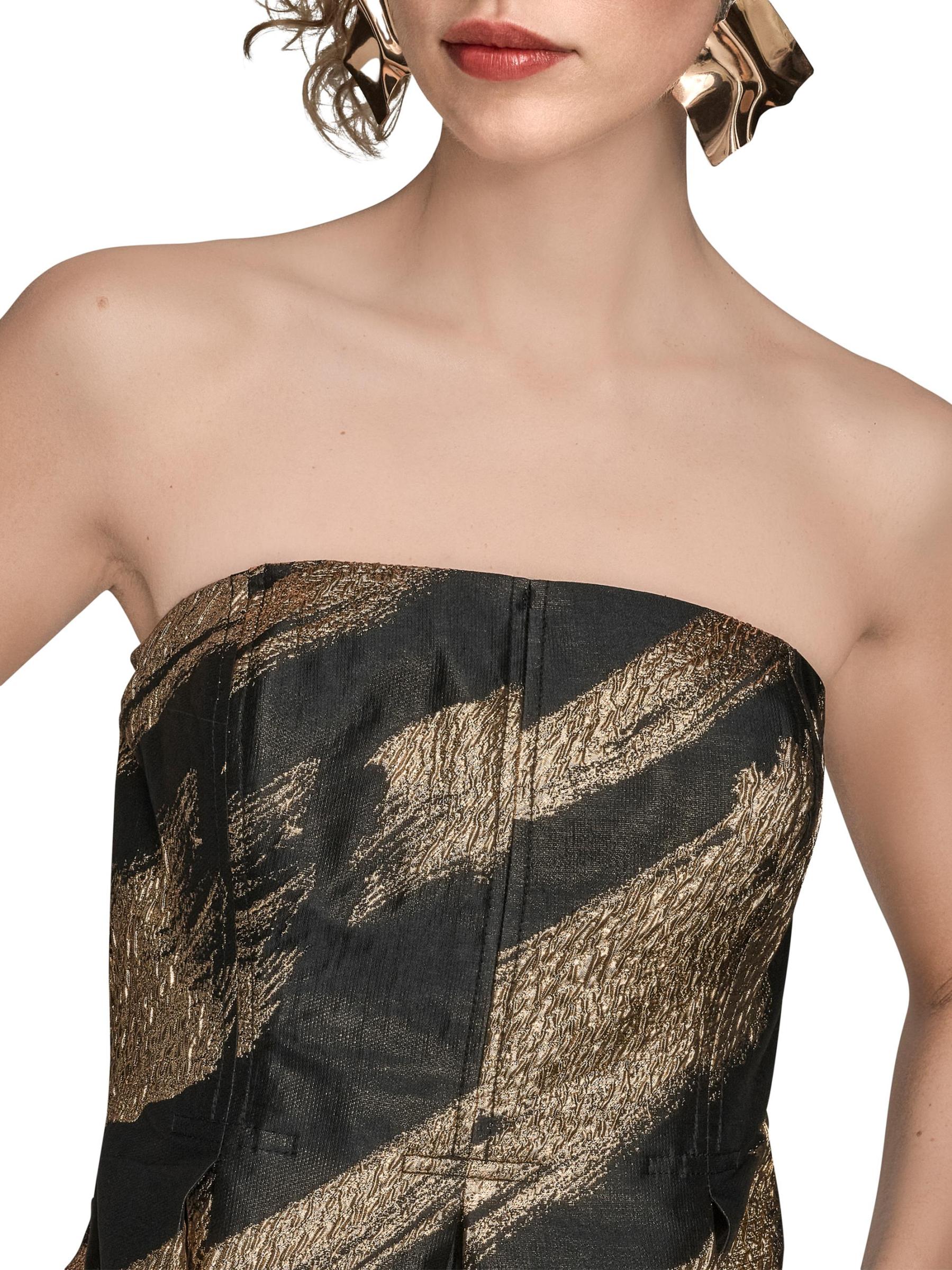 فستان DKNY بدون حمالات مصنوع من قماش الديباج، ويتميز بتصميم معدني تجريدي.