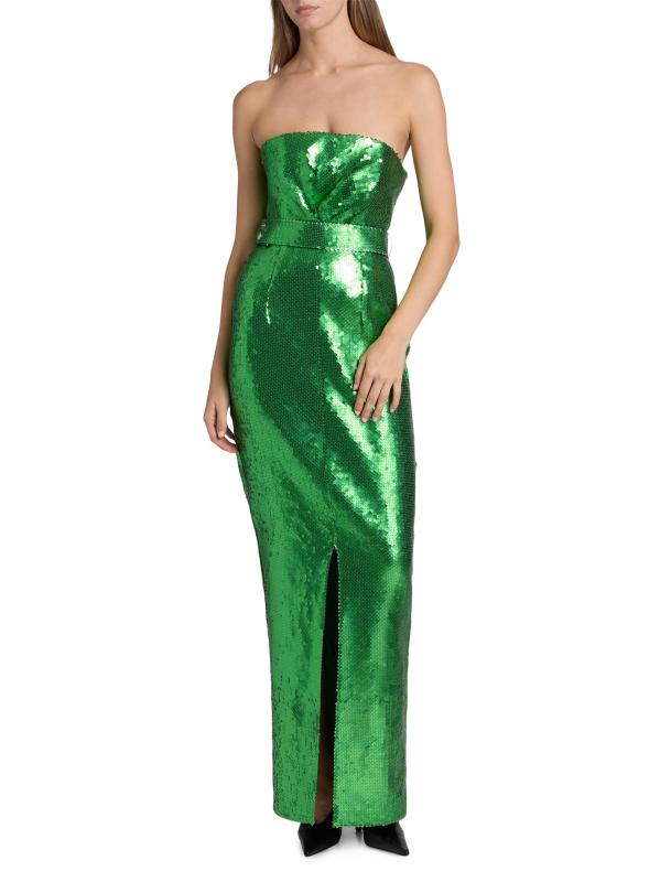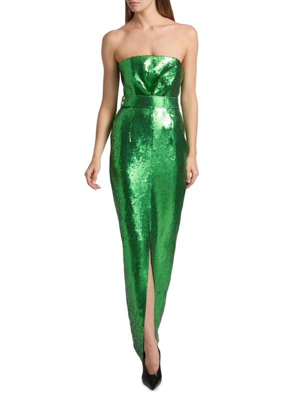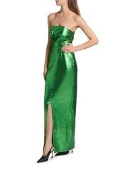 صُنع فستان Aeta من 16Arlington في المملكة المتحدة، وهو مزين بالترتر ويتميز بتقويرة باندو وشق أمامي.