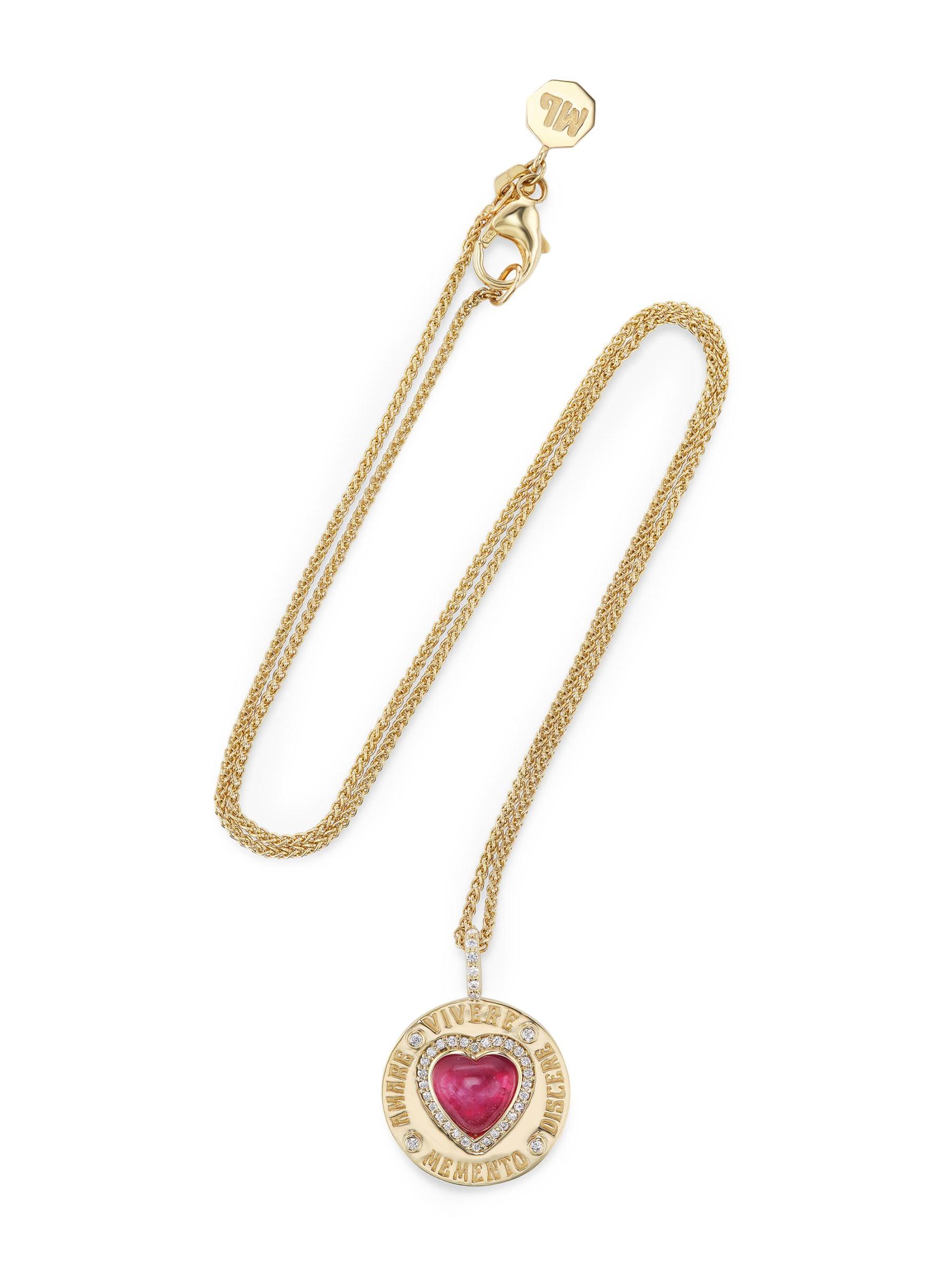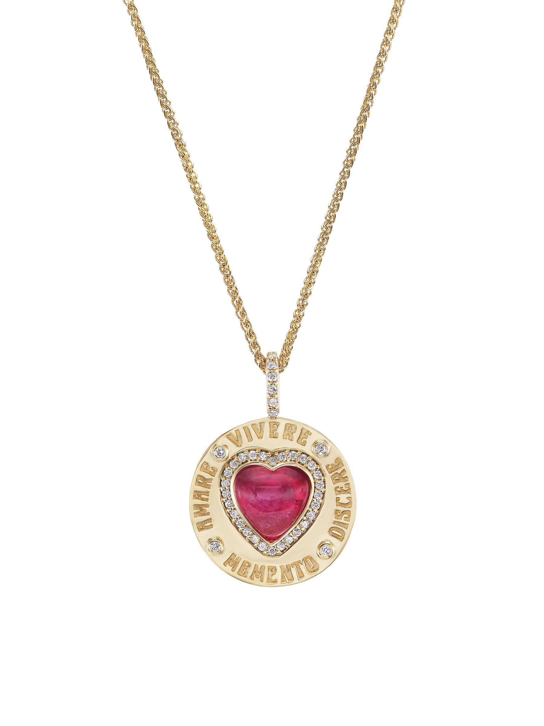 من مجموعة Agape. قلادة Greek Love من Marlo Laz المصنوعة من الذهب الأصفر عيار 14 قيراطًا، تتميز قلادة Greek Love بقلادة ميدالية صغيرة مزينة بكابوشون التورمالين الوردي على شكل قلب والماس البافي اللامع. هذا السحر اللافت للنظر تحده حروف «Vivere» و «Discere» و «Memento» و «Amore».التورمالين الوردي، 1.65 tcw ألماس، 0.21 طن ذهب أصفر عيار 14 مشبك لوبستر صُنع في الولايات المتحدة الأمريكية