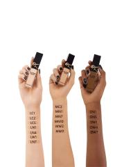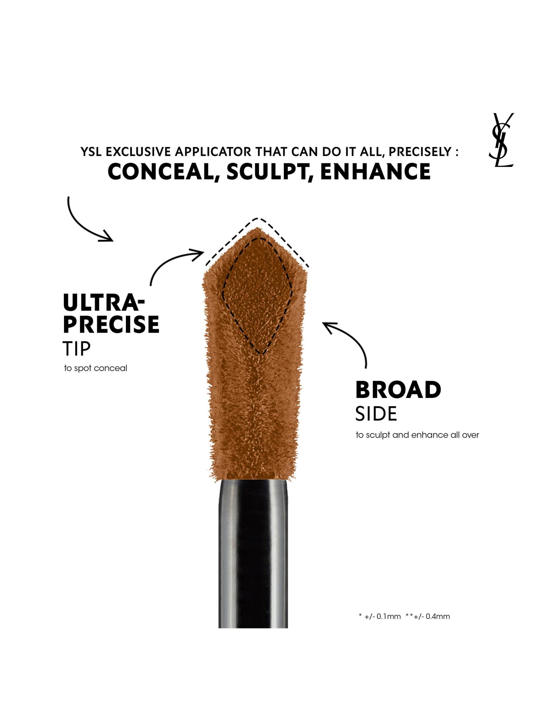 ضعيه بثلاث طرق باستخدام طريقة YSL الأيقونية: عززي لون البشرة بدلاً من كريم الأساس، باستخدام الجانب العريض من أداة التطبيق لرسم علامات Y على منطقة T وتحت العينين وعلى طول عظام الخد. اضغط بأطراف الأصابع أو استخدم فرشاة للمزج في أي مكان تريده. اختاري ظل الكونسيلر الذي يتناسب مع لون البشرة لهذه الطريقة.2. يمكنك إخفاء العيوب باستخدام الطرف فائق الدقة للوصول إلى جميع الزوايا بخبرة. للاختباء تحت العينين، استخدمي الطرف فائق الدقة لرسم شكل Y جانبي يبدأ بحرف V تحت الزوايا الخارجية للعين ويربطه بخط مستقيم على طول العظم المداري. انقر بأطراف الأصابع أو الفرشاة لمزج المنتج أو نشره أو تخفيفه في أي مكان لإخفائه. اختاري ظل الكونسيلر الذي يتناسب مع لون البشرة لهذه الطريقة. 3. قومي بنحت الوجه باستخدام ظل أفتح من كريم الأساس لإضفاء السطوع وبناء الأبعاد بظل أعمق من كريم الأساس. باستخدام الجانب النحيف، ارسم خطًا باللون الفاتح من أسفل الأنف إلى زاوية الفم. باستخدام الجانب العريض من أداة التثبيت، ارسمي خطًا باللون الأعمق من نهاية عظمة الخد وقم بتوصيل الخطوط. امزجي حرف Y للحصول على مظهر مكياج منحوت وأكثر تحديدًا.
