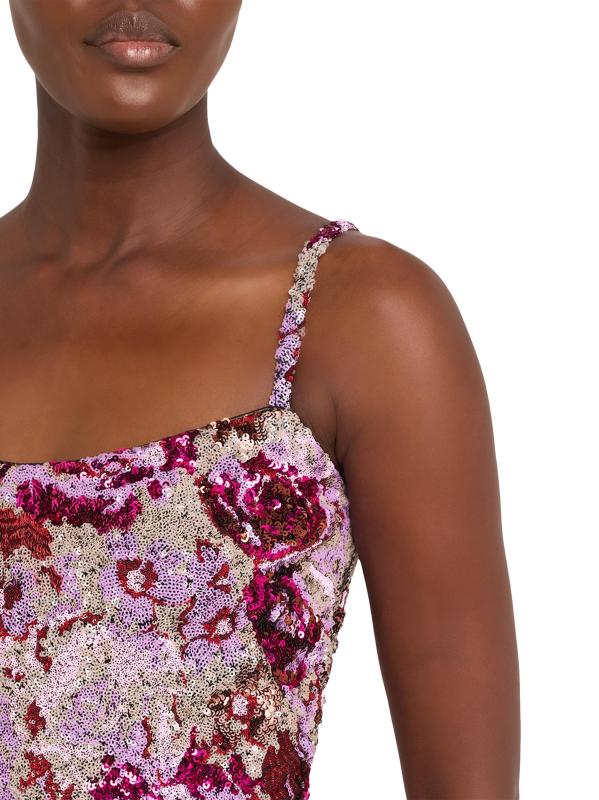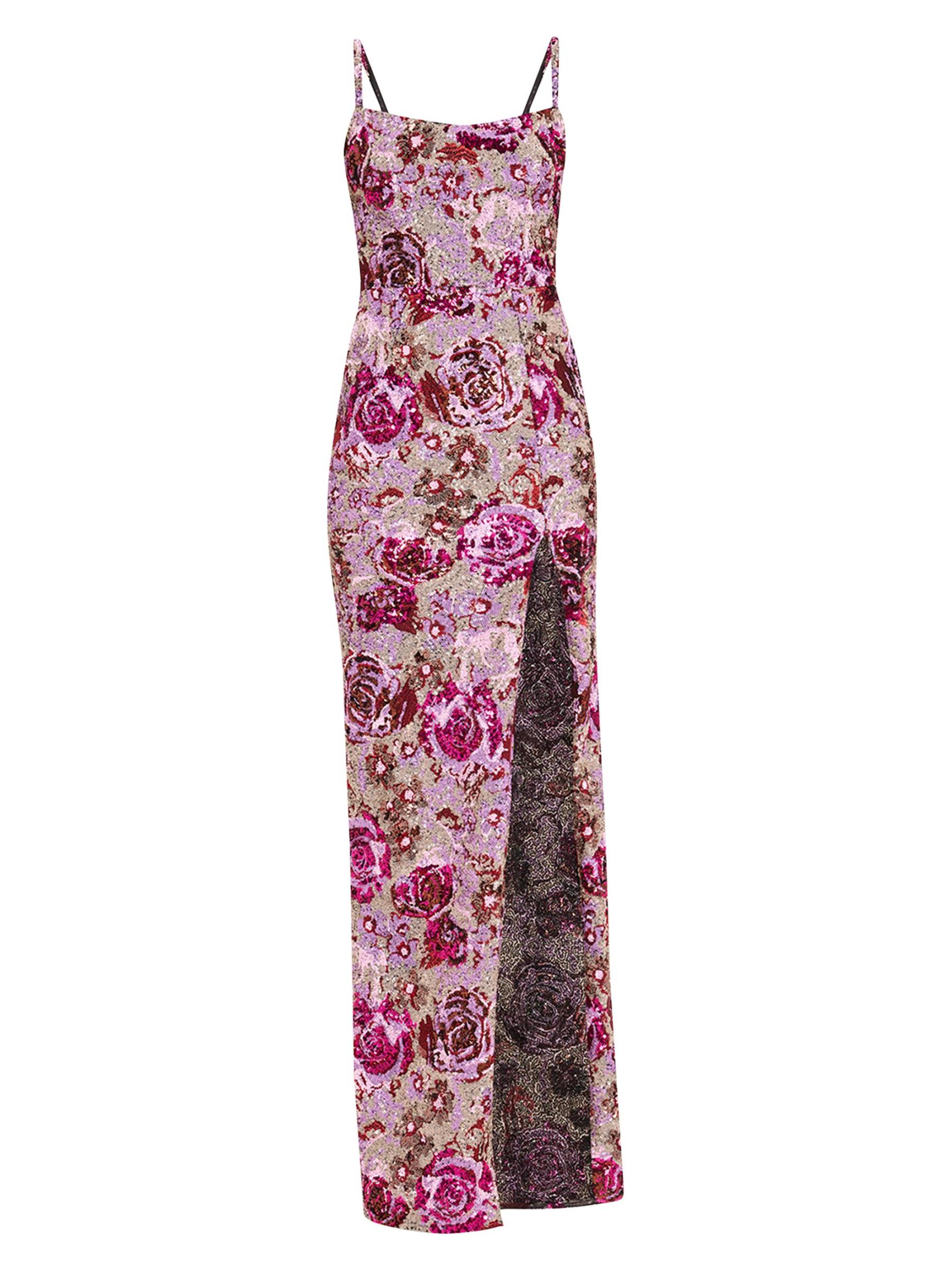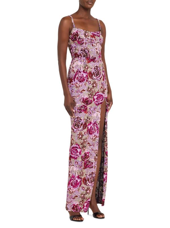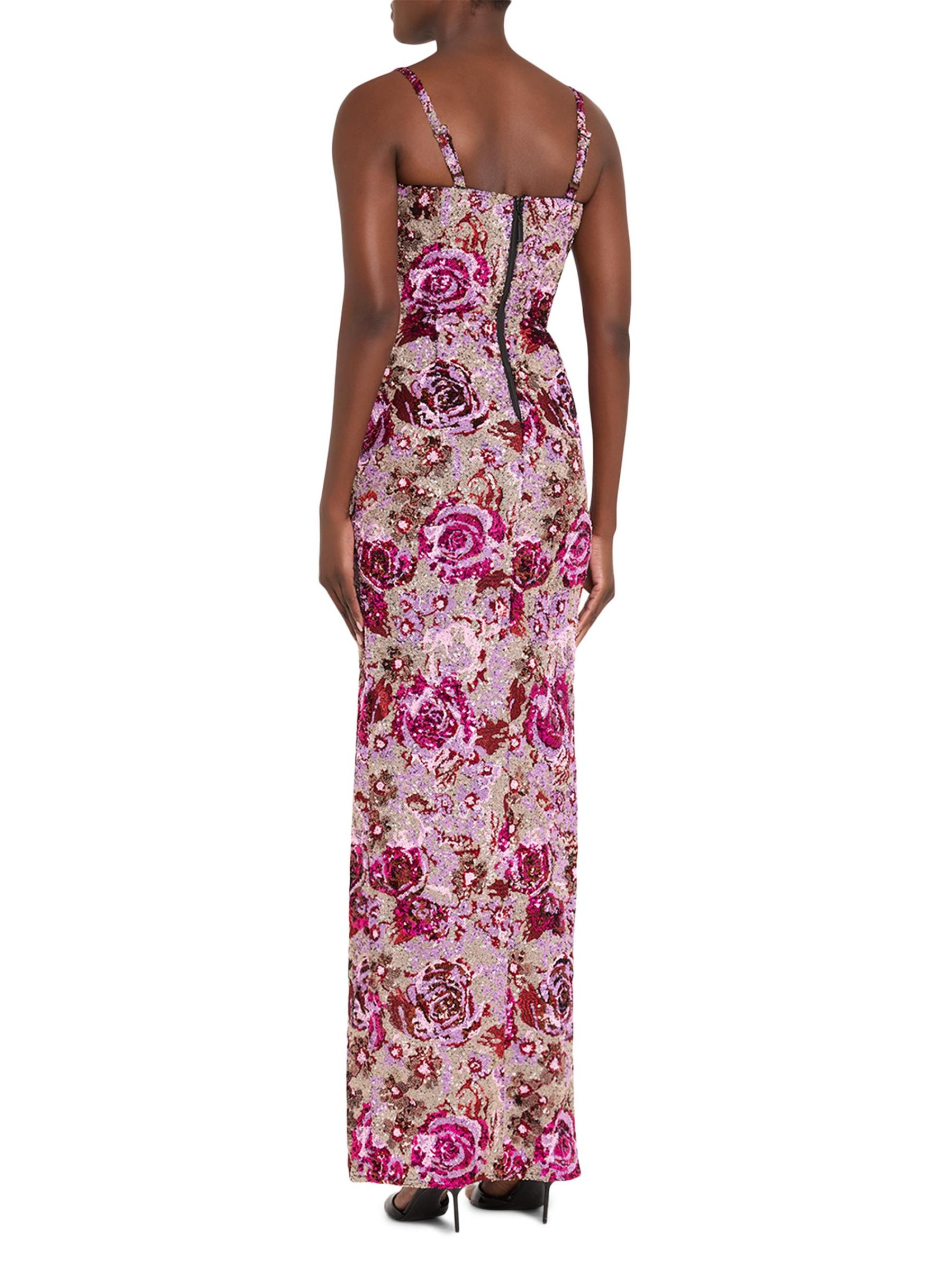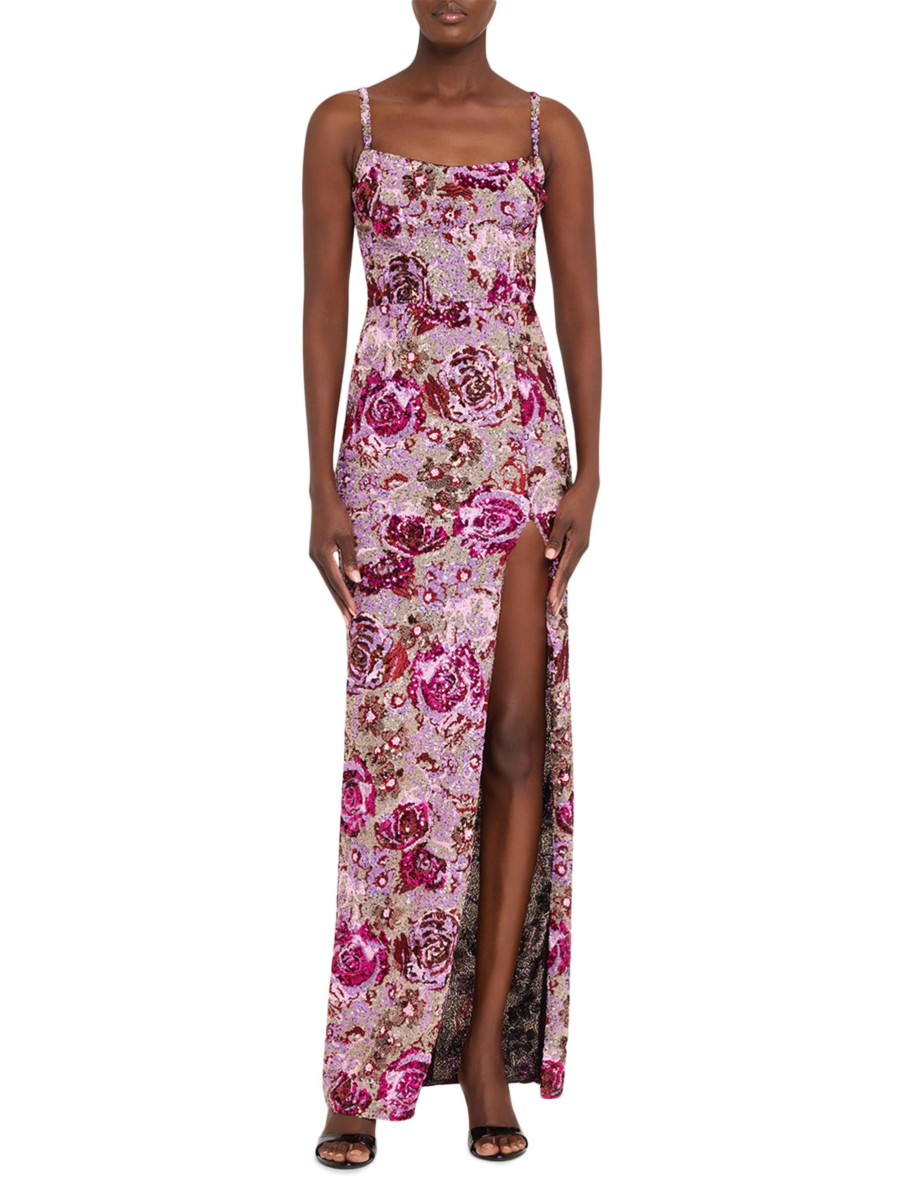 من برونكس وبانكو، تم تصميم هذا الفستان الطويل المزين بالترتر الزهري بشق يصل إلى الفخذ وتم تشطيبه بأحزمة قابلة للتعديل لملاءمة مخصصة.