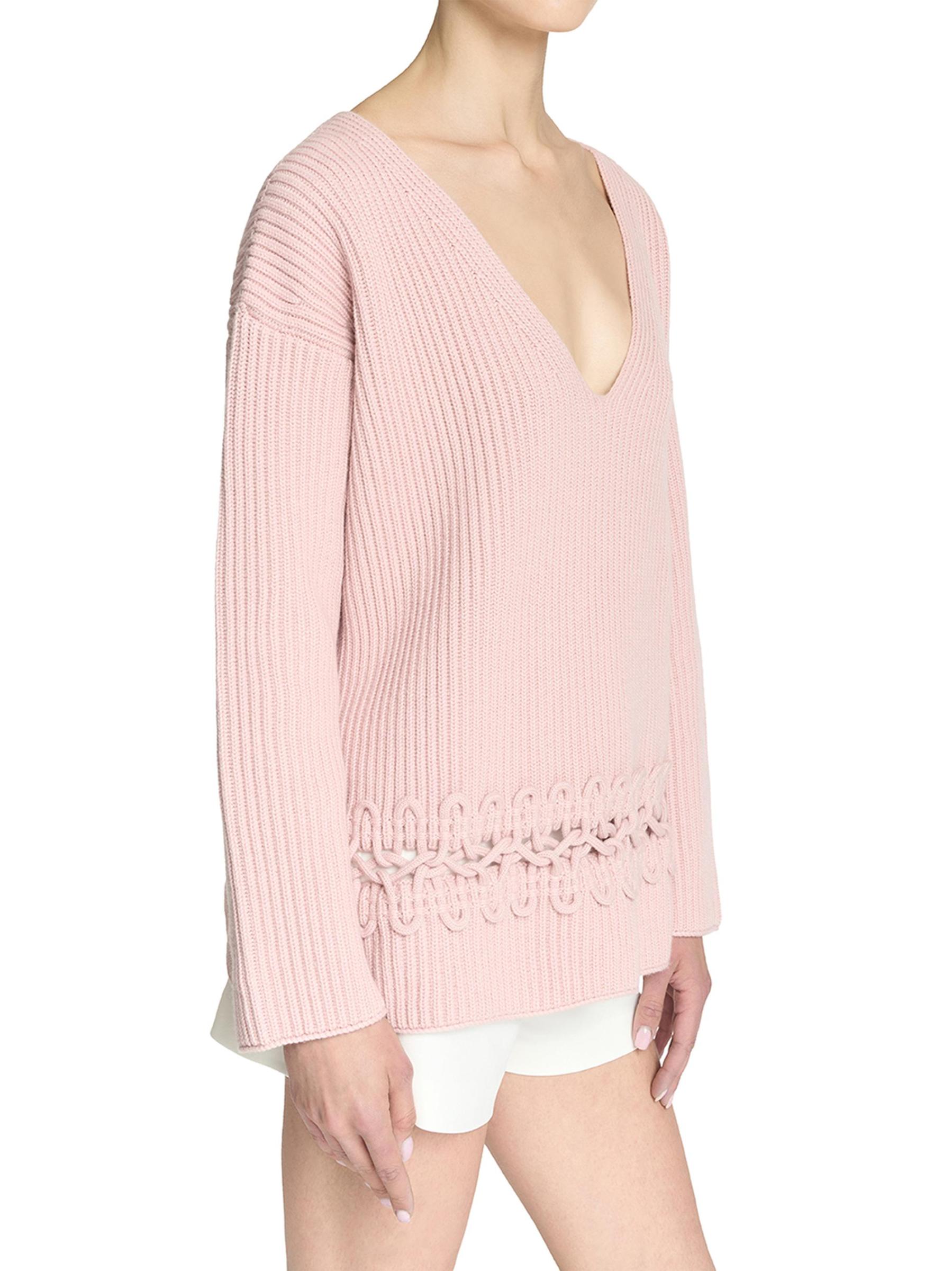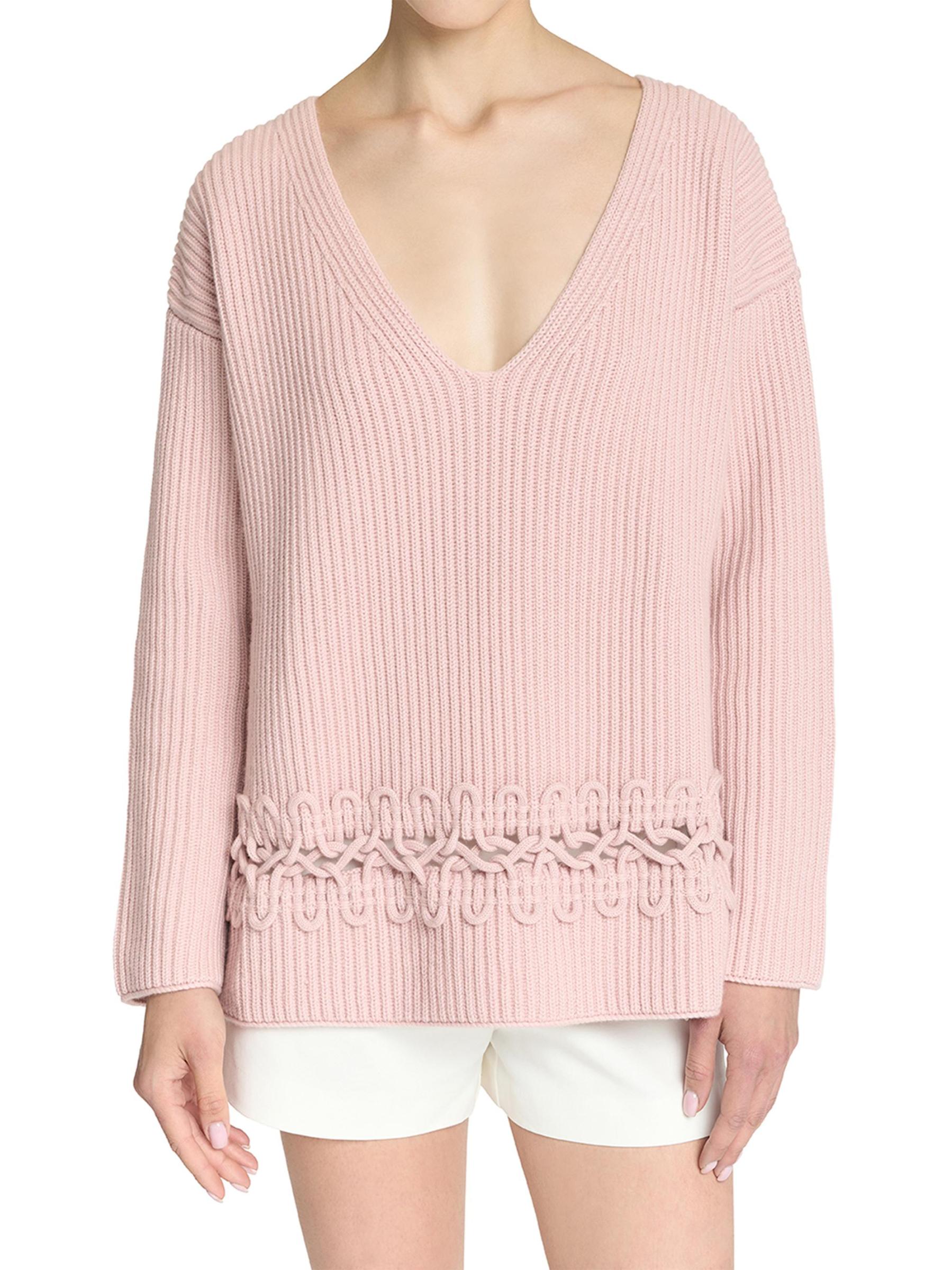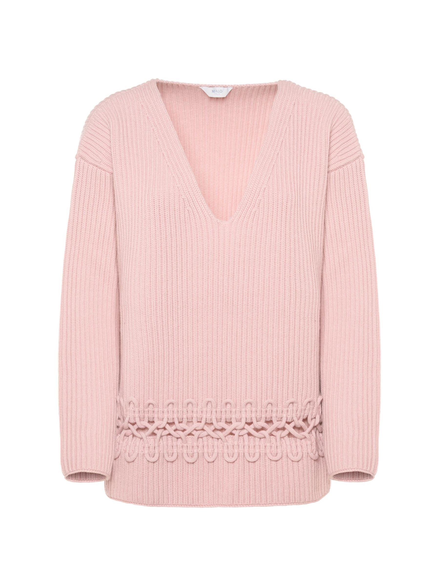 حصري. من مجموعة كبسولات أرشيف مالو. هذه السترة الإنجليزية المحبوك من مالو مصنوعة من الكشمير ومصممة برقبة على شكل حرف V وزخرفة مضفرة مطرزة يدويًا على طول الحافة.