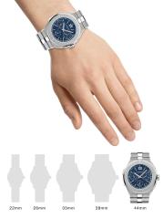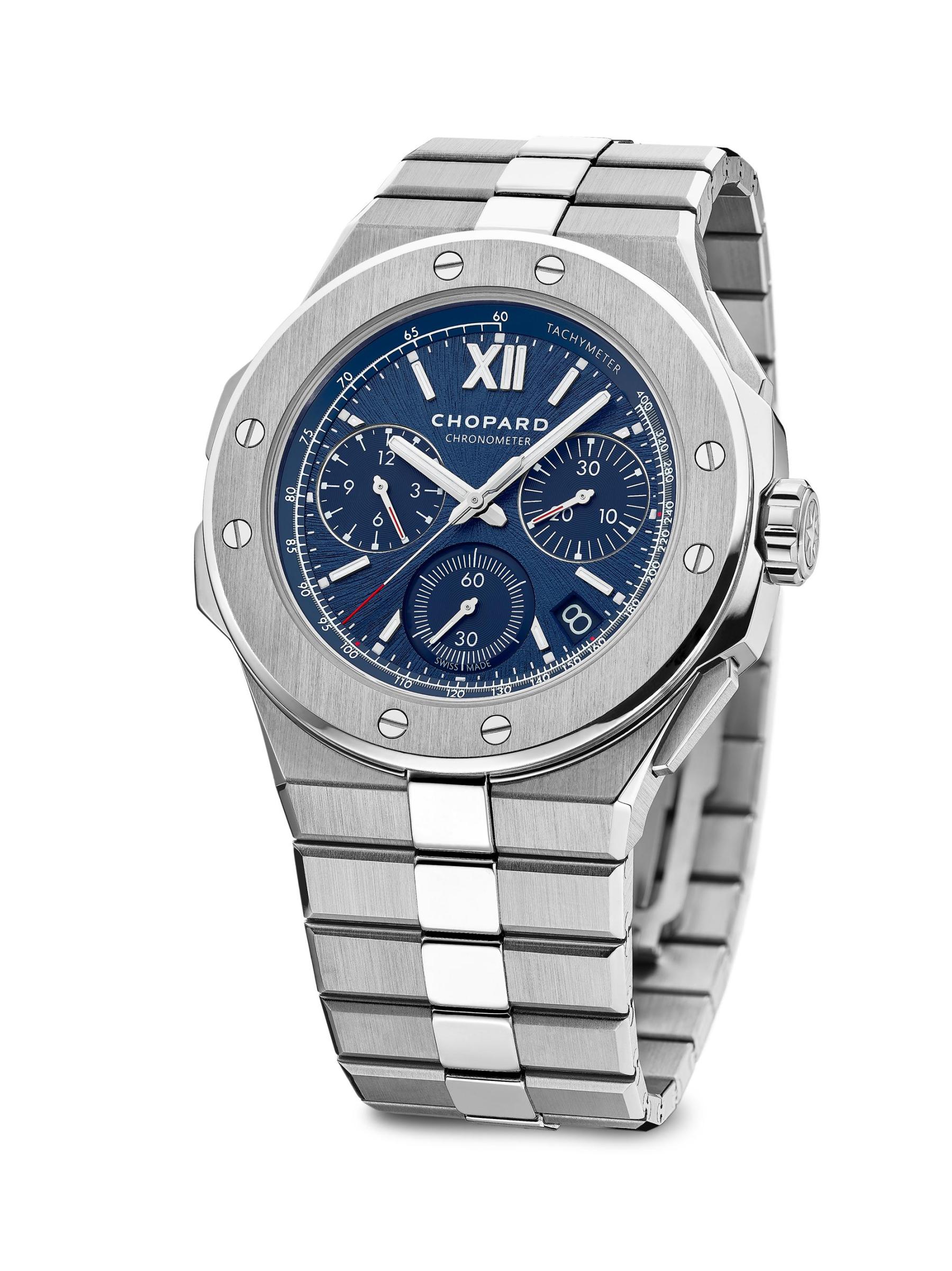 من مجموعة ألبين إيجل. هذه الساعة الرياضية الأنيقة والمعاصرة والراقية مستوحاة من تصميم ساعة سانت موريتز، المدعومة بحركة معتمدة من كرونومتر داخل الغلاف الأنيق المصنوع من الفولاذ المقاوم للصدأ المصقول. يُبرز القرص المزركش بزخرفة الشمس قزحية النسر - مع الأرقام الرومانية المطلية بالروديوم وعلامات الساعات.حركة كرونوغراف ميكانيكية كريستال ياقوتي مقاوم للوهج ومقاوم للخدش تاج لولبي مينا صن برست ستيل باللون الأزرق ثلاثة أقراص فرعية علامات الساعات بالأرقام الرومانية اليد الثانية غطاء خلفي شفاف من الكريستال الياقوتي إطار وسوار من الفولاذ المقاوم للصدأ مشبك قابل للنشر صُنع في سويسرا