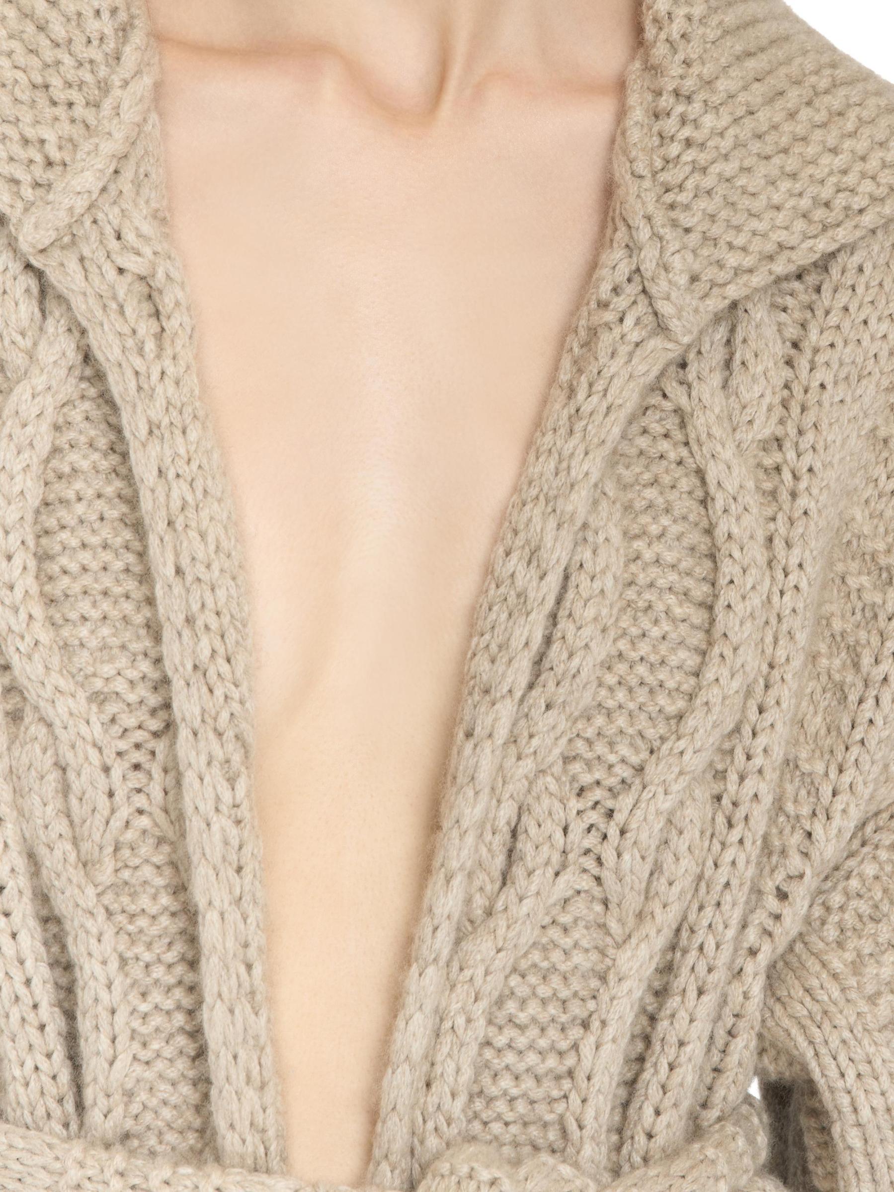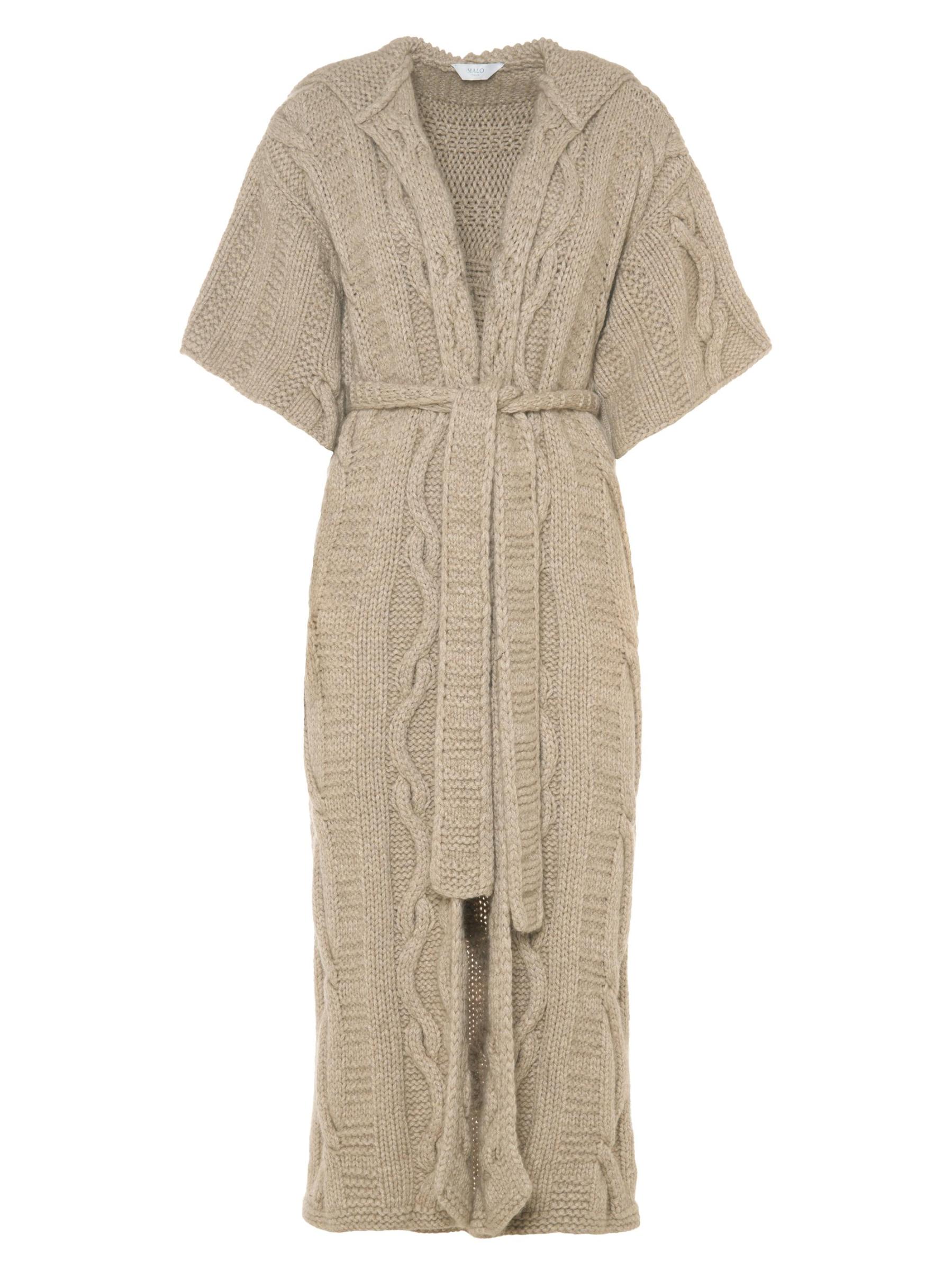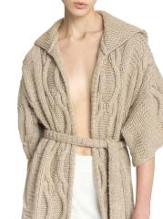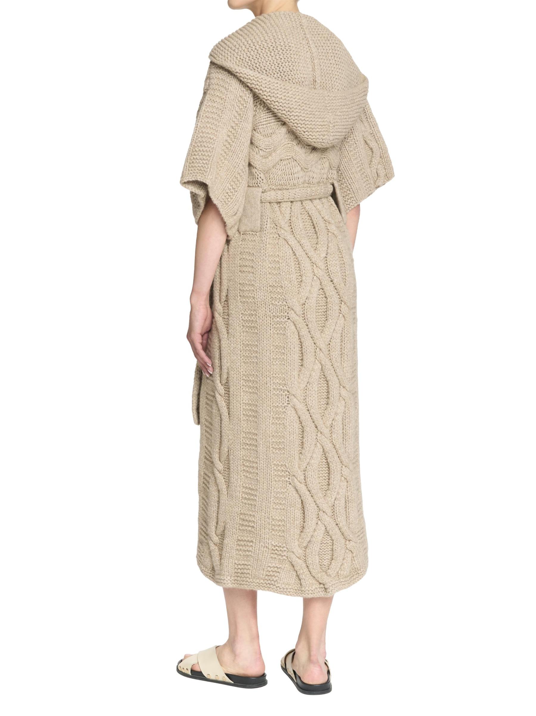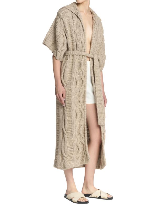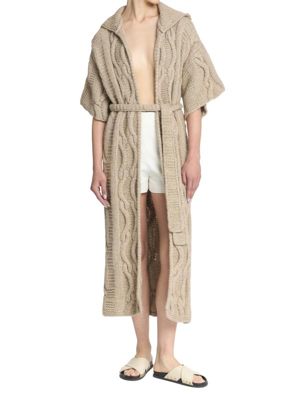 تتميز هذه السترة المصممة على شكل رداء من مالو بتصميم منسوج يدويًا من الكشمير الإيطالي بتصميم مزخرف يجمع بين الكابلات والتضليعات المزركشة. ويكتمل التصميم بقلنسوة مريحة كبيرة الحجم وحزام قابل للربط الذاتي.