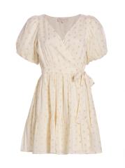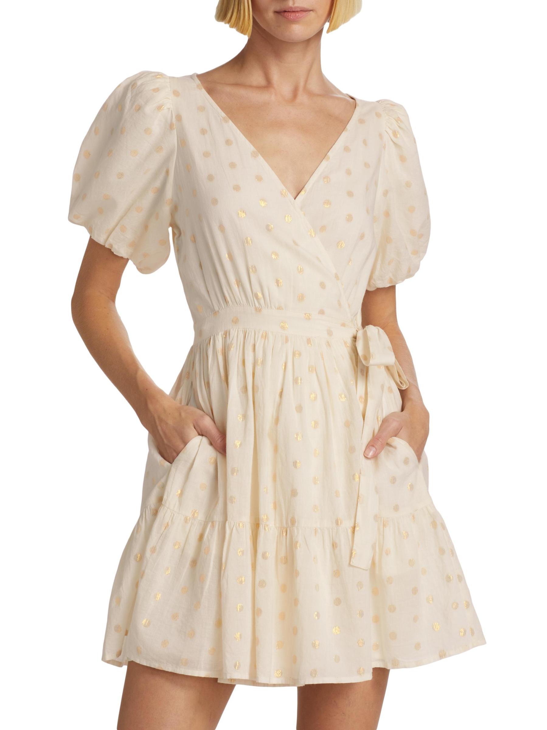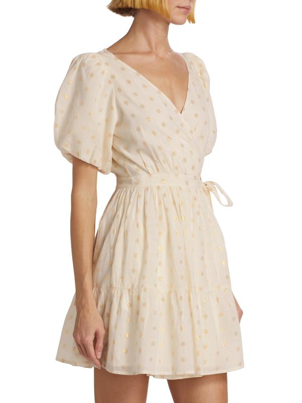يتميز فستان آنا من Love the Label بنمط نقطي معدني وفتحة رقبة على شكل حرف V. تُكمل الأكمام القصيرة المنفوخة والزخارف المتباينة هذه القطعة ذات الطول الصغير.
