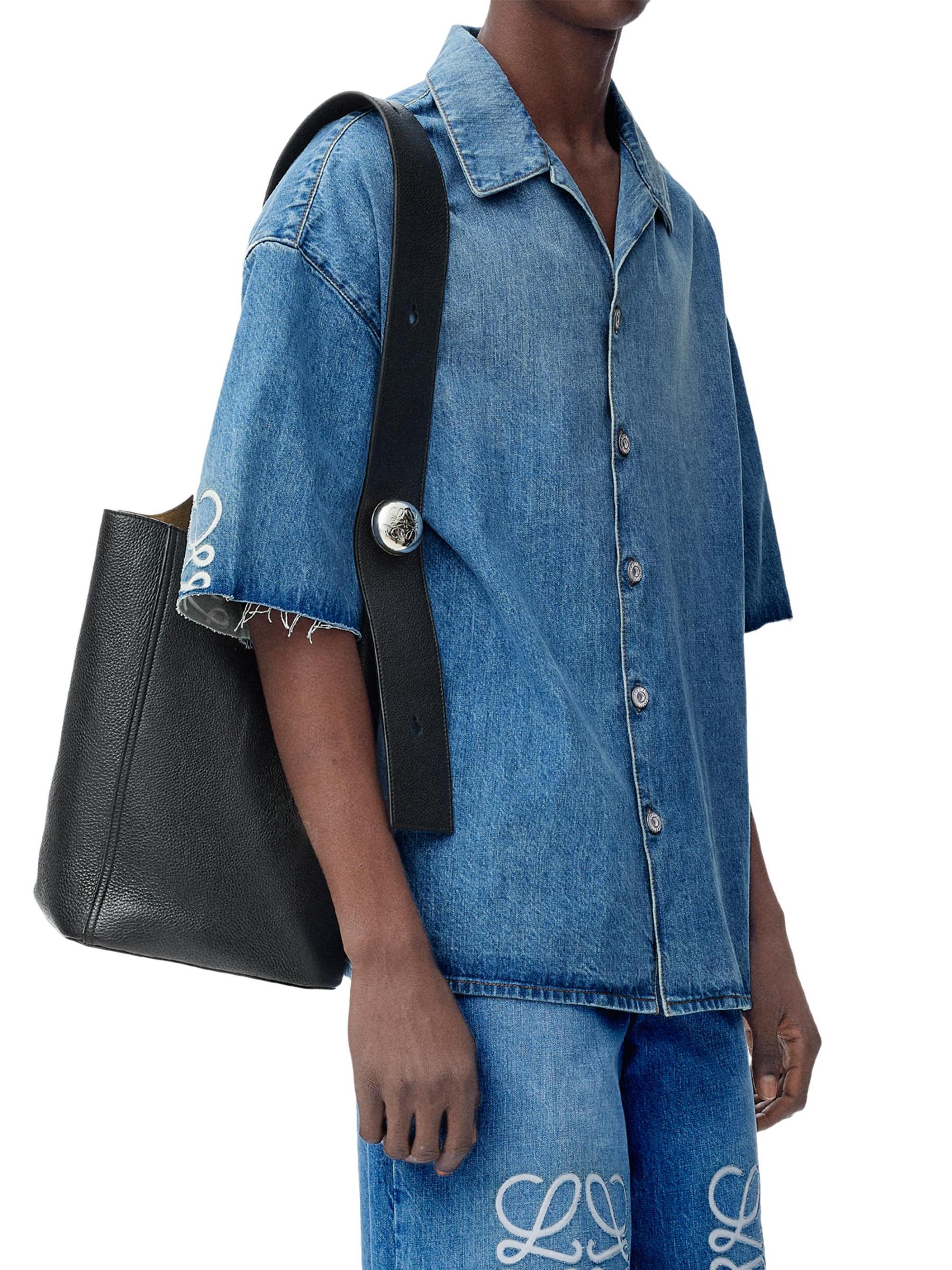 يتميز هذا القميص المصنوع من الدنيم القطني بشعارات LOEWE المميزة على الأكمام القصيرة. تتميّز الفتحة الأمامية بأزرار معدنية، في حين يضفي الطوق المخيّم هيكلًا مريحًا على هذا النمط.