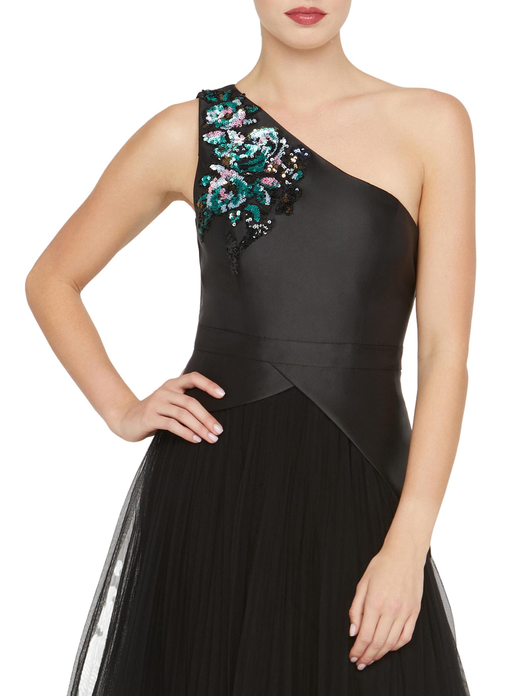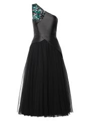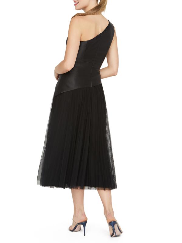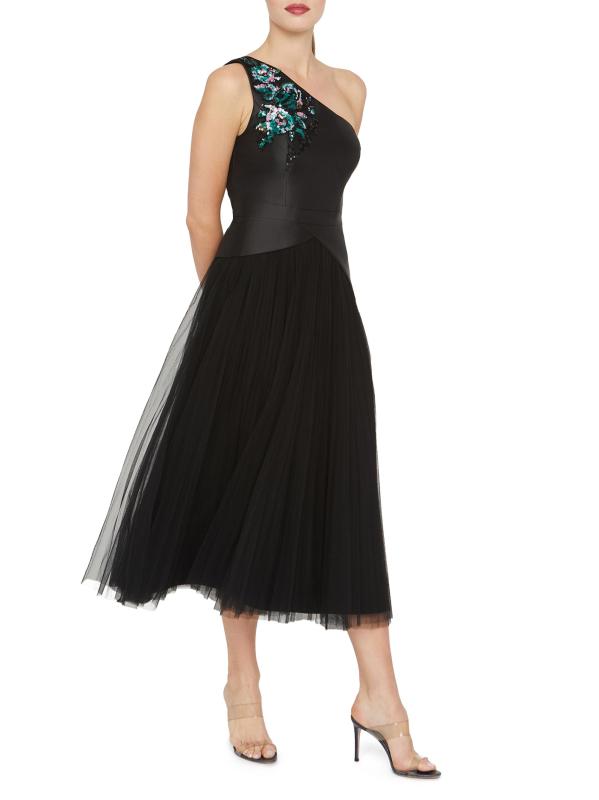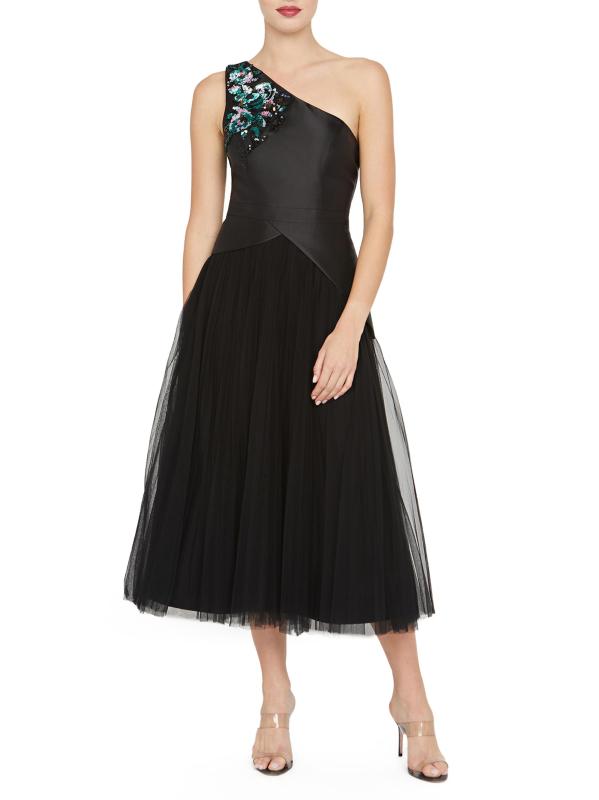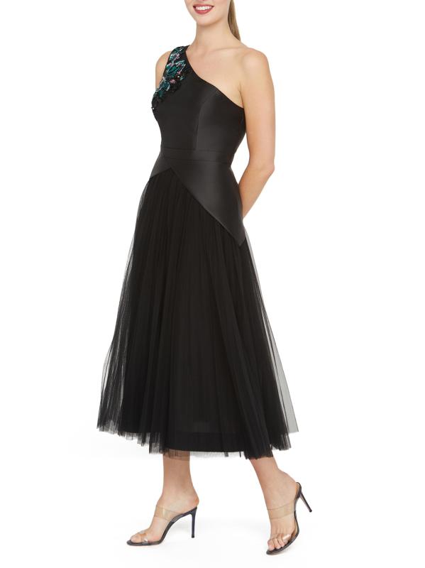 يتميز فستان أنابيث لحفل الكوكتيل بطول الشاي من كاي أنغر بتصميم بكتف واحد مع زخارف مطرزة بالخرز لمزيد من اللمعان. تمزج هذه القطعة، المُحاكة عند الخصر، بين الساتان المرن وشبكة التول المفصولة بتفاصيل البيبلوم غير المتماثلة.