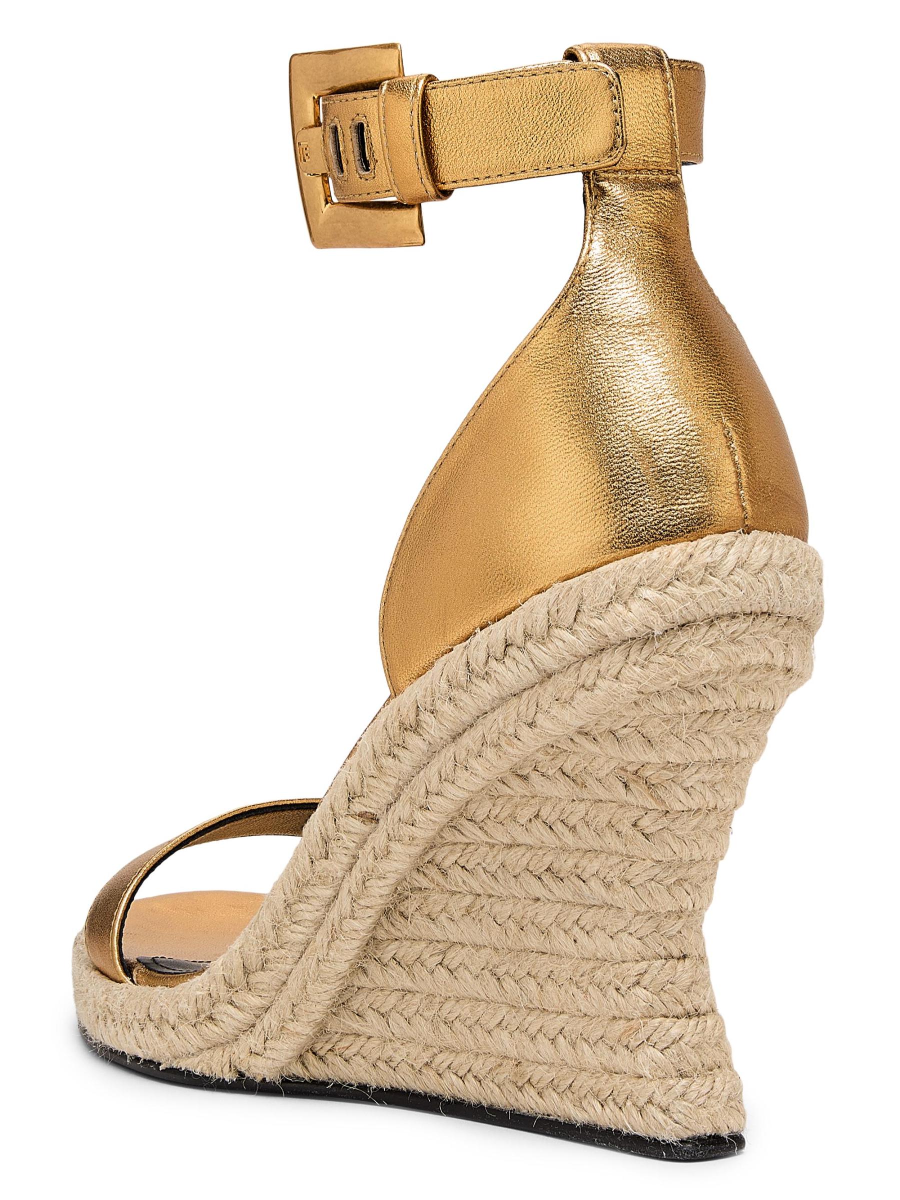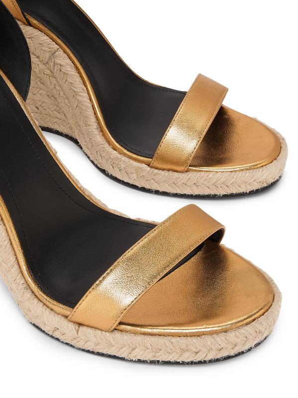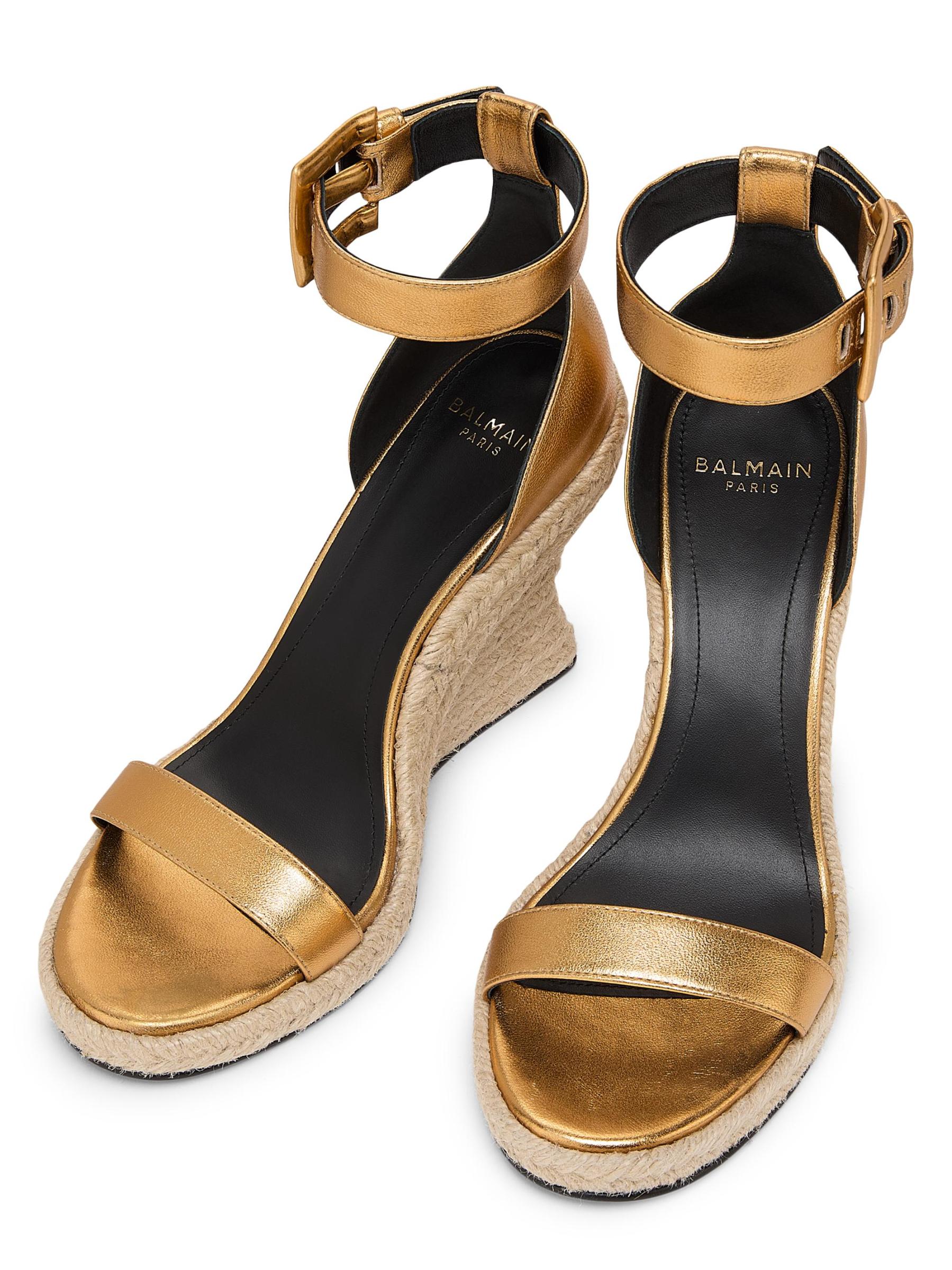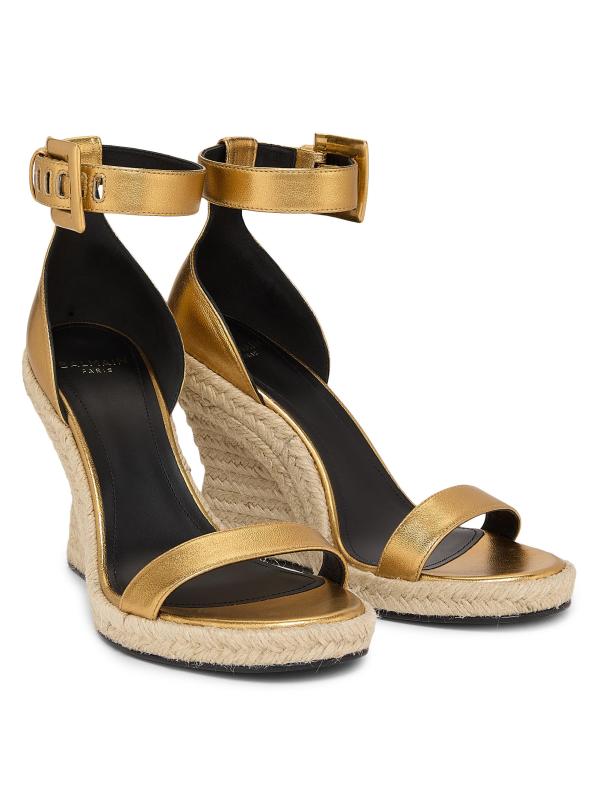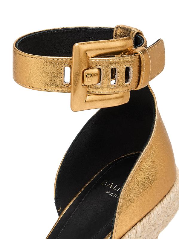حصري. من كبسولة XO. يتميز صندل Anthem espadrille من Balmain بجزء علوي من الجلد اللامع وإغلاق بإبزيم مميز. تم تصميم هذا الزوج بكعب إسفين منحني ومنسوج من الجوت.