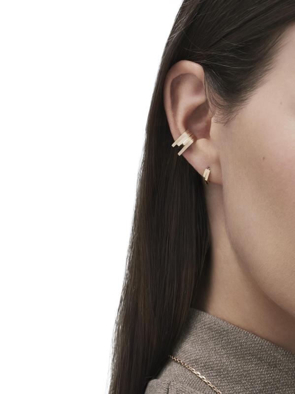 من مجموعة Antifer. تم تحديد سوار الأذن الخاص بـ Repossi بخط بسيط مرسوم لتشكيل قمم قوية، وهو مصنوع من الذهب الوردي المصقول عيار 18 قيراطًا.