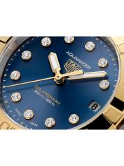 من مجموعة أكواريسر. تتميز ساعة TAG Heuer هذه المصنوعة من الذهب الأصفر عيار 18 قيراطًا والفولاذ المقاوم للصدأ بمينا بلون أشعة الشمس باللون الأزرق الداكن مع علامات الساعة الماسية البراقة وعرض التاريخ عند الساعة الثالثة. هذه الساعة المذهلة مقاومة للماء حتى 20 ATM، مما يجعلها مثالية للسباحة والرياضات المائية عالية التأثير والغوص.حركة شمسية سويسرية إطار دوار كريستال ياقوتي قرص أشعة الشمس باللون الأزرق الداكن علامات الساعة الماسية، 0.15 tcw عرض التاريخ عند الساعة الثالثة اليد الثانية إطار وسوار من الذهب الأصفر عيار 18 قيراطًا والفولاذ المقاوم للصدأ مشبك قابل للنشر صُنع في سويسرا