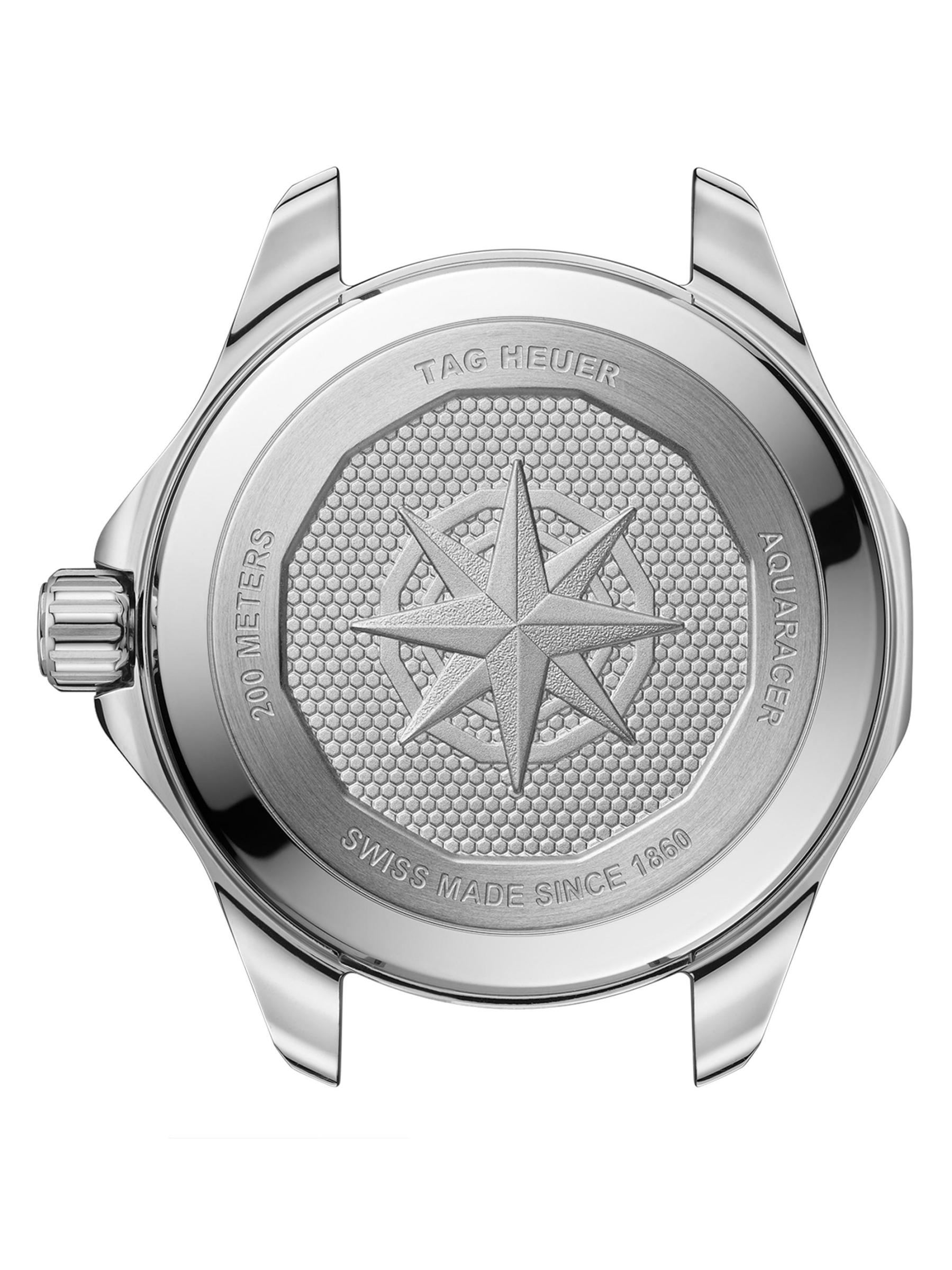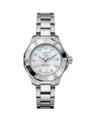 من مجموعة أكواريسر. تتميّز ساعة TAG Heuer المصنوعة من الفولاذ المقاوم للصدأ بإطار دوار وبقرص أبيض مضيء من عرق اللؤلؤ مع علامات ساعة من الألماس. هذه الساعة المذهلة مقاومة للماء حتى 20 ATM، مما يجعلها مثالية للسباحة والرياضات المائية عالية التأثير والغوص.