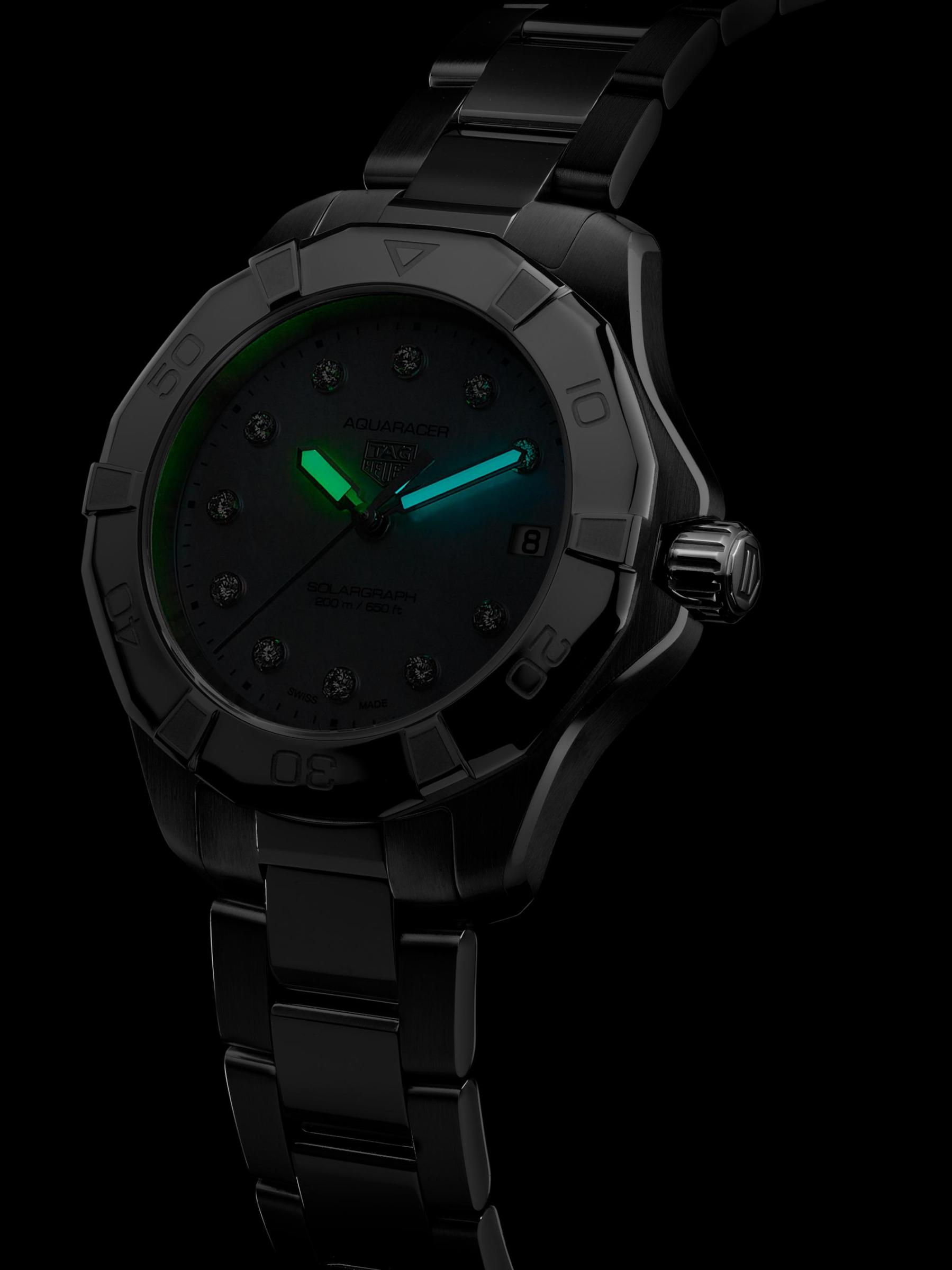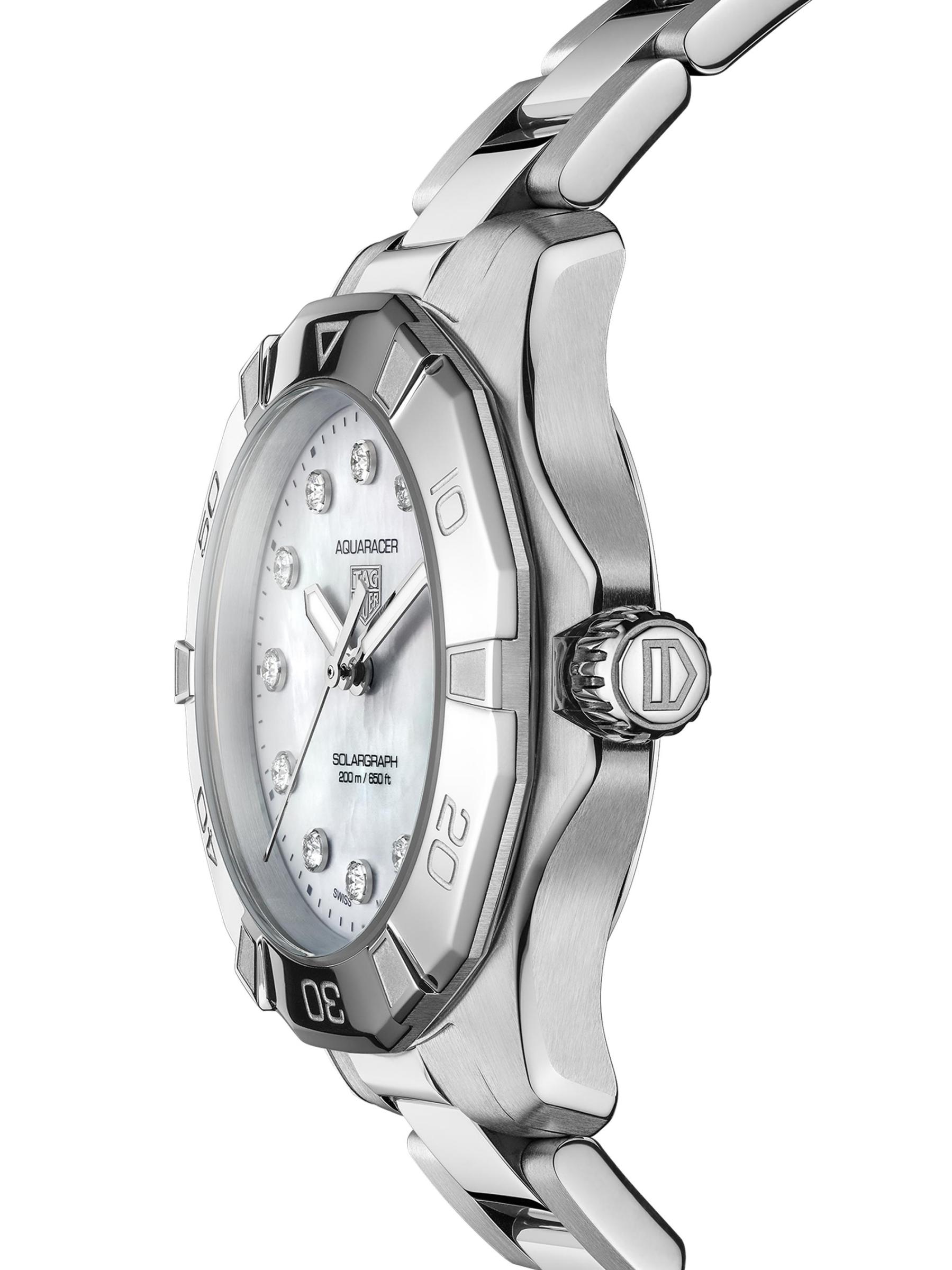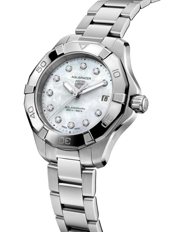 من مجموعة أكواريسر. تتميّز ساعة TAG Heuer المصنوعة من الفولاذ المقاوم للصدأ بإطار دوار وبقرص أبيض مضيء من عرق اللؤلؤ مع علامات ساعة من الألماس. هذه الساعة المذهلة مقاومة للماء حتى 20 ATM، مما يجعلها مثالية للسباحة والرياضات المائية عالية التأثير والغوص.حركة سولارغراف إطار دوار علامات الساعة الماسية، 0.15 tcw كريستال ياقوتي قرص أبيض من عرق اللؤلؤ أيدي مليئة بمادة سوبر لومينوفا® عرض التاريخ عند الساعة الثالثة اليد الثانية إطار وسوار من الفولاذ المقاوم للصدأ مشبك قابل للنشر صُنع في سويسرا