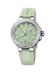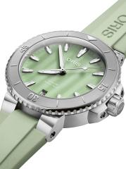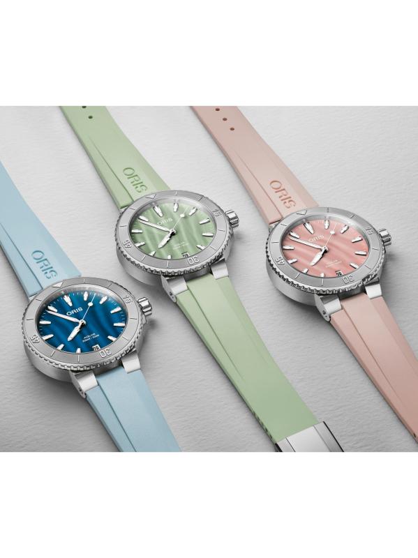 من مجموعة Aquis. تتميز ساعة Oris المصنوعة من الفولاذ المقاوم للصدأ بقرص أخضر من عرق اللؤلؤ على حزام مطاطي ملون. هذا النمط الكلاسيكي متوفر باللون الوردي والأزرق والأخضر.