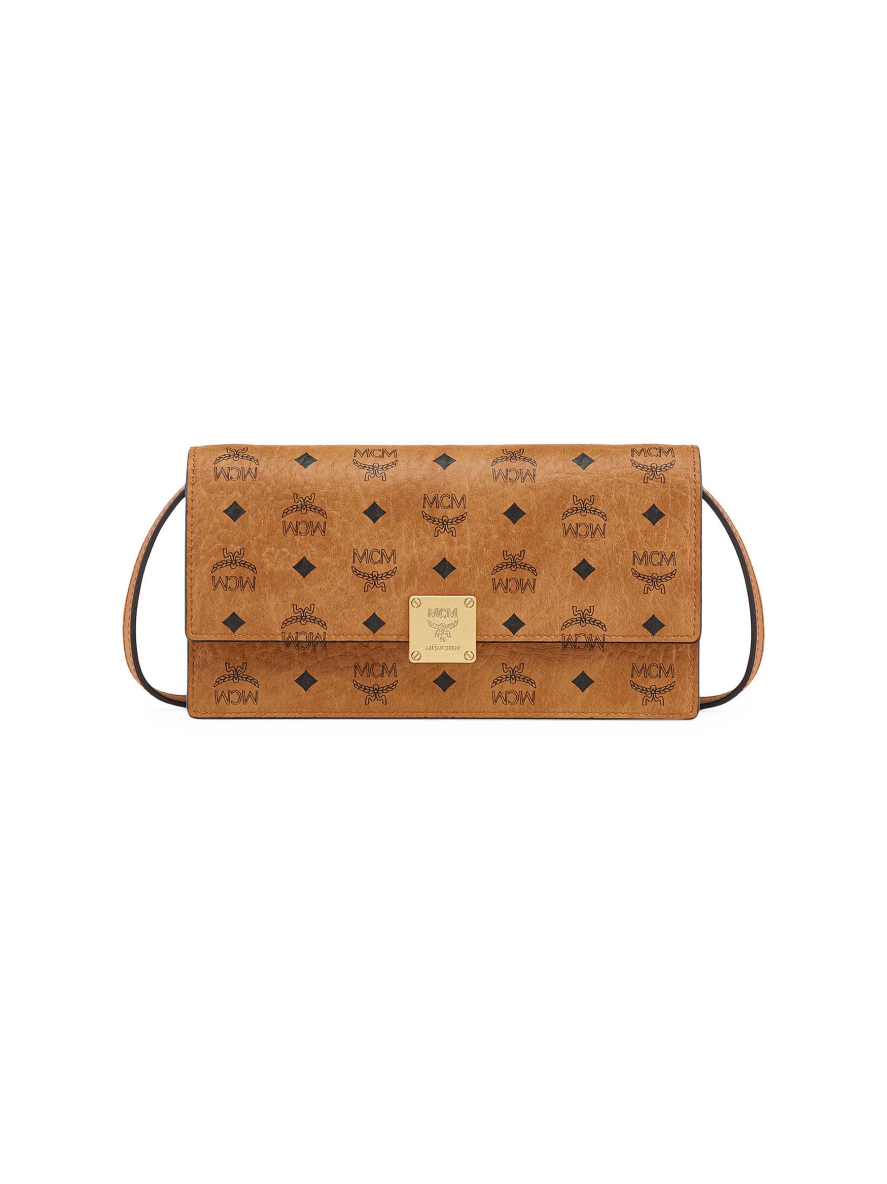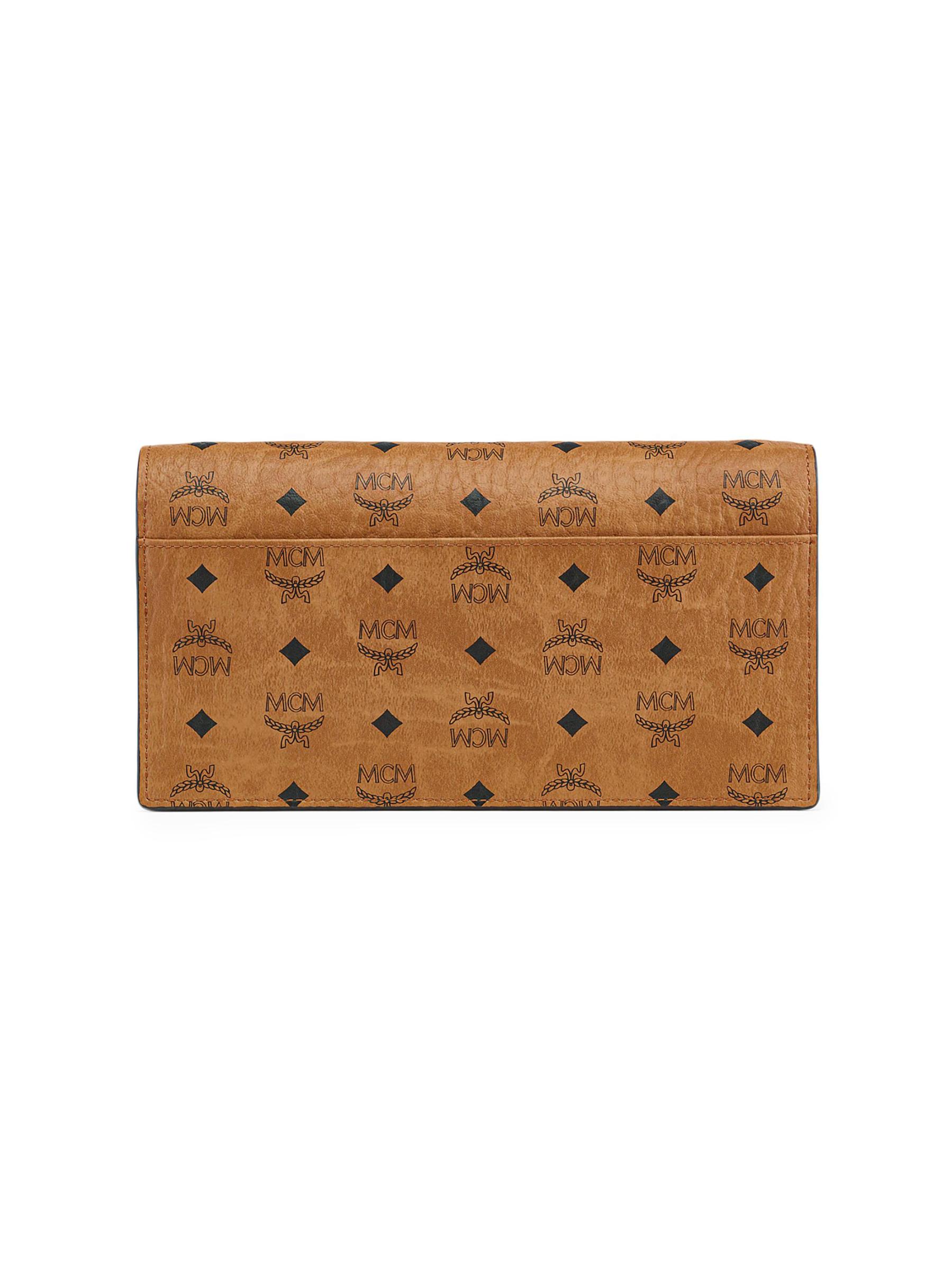 تتميز محفظة Aren الكبيرة من MCM بطبعة Visetos المميزة وإغلاق ذهبي منقوش بشعار الماركة.