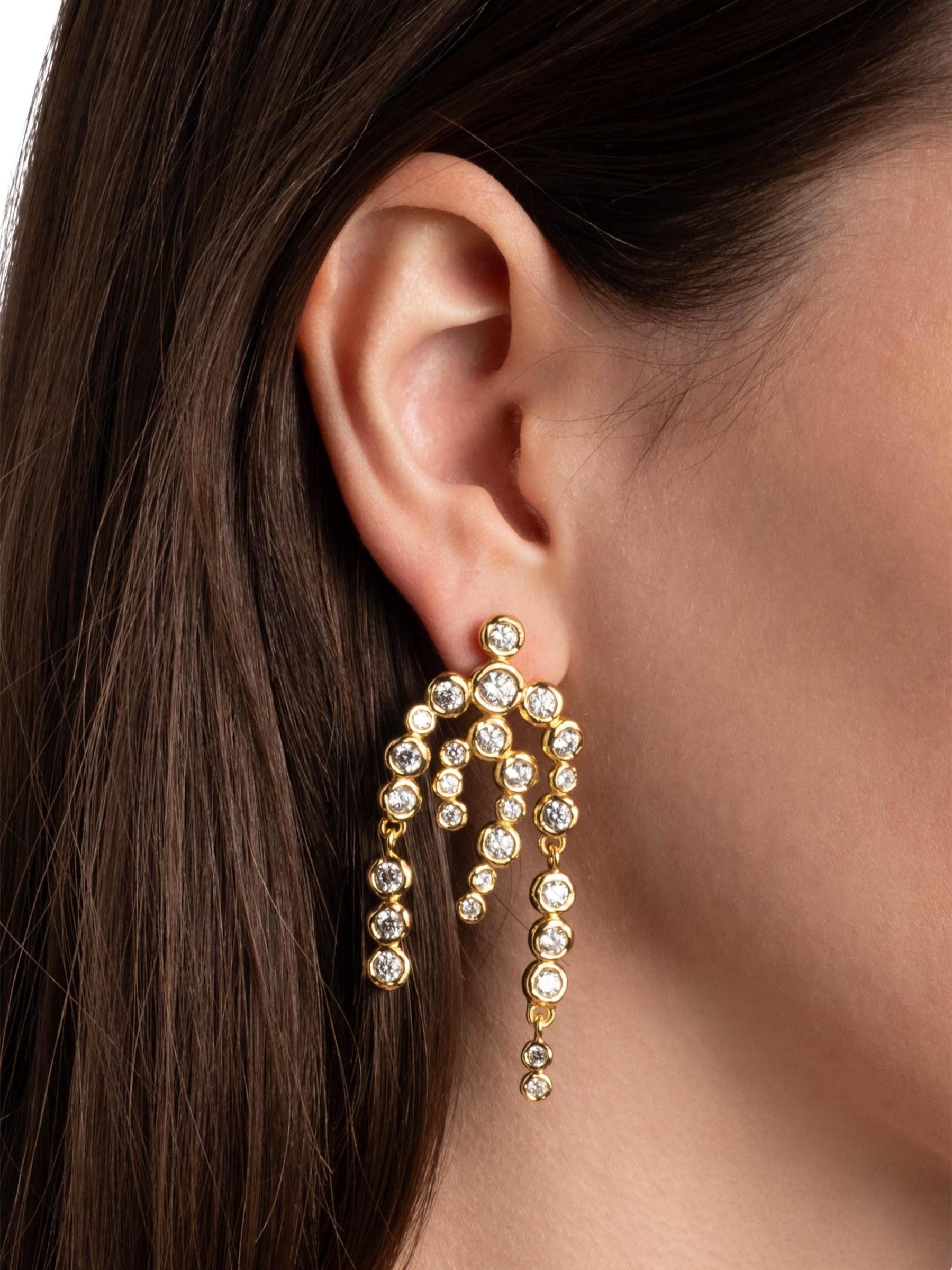 من مجموعة أستيراليس. تتميز أقراط Alexis Bittar المصنوعة من الثريا المطلية بالذهب عيار 14 قيراطًا بزركونيا مكعبة مرصعة بإطارات لامعة متدلية من عمود خلفي.