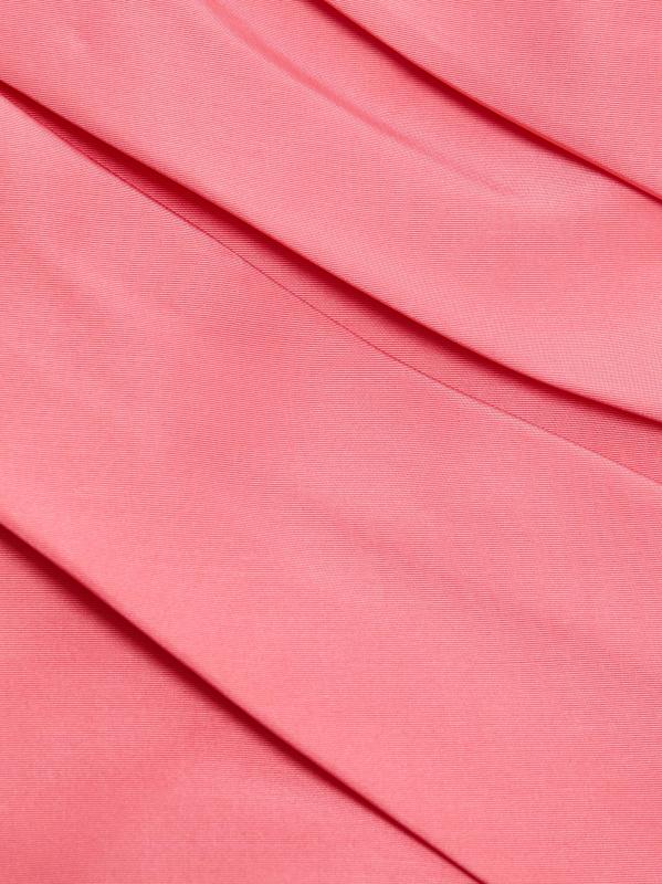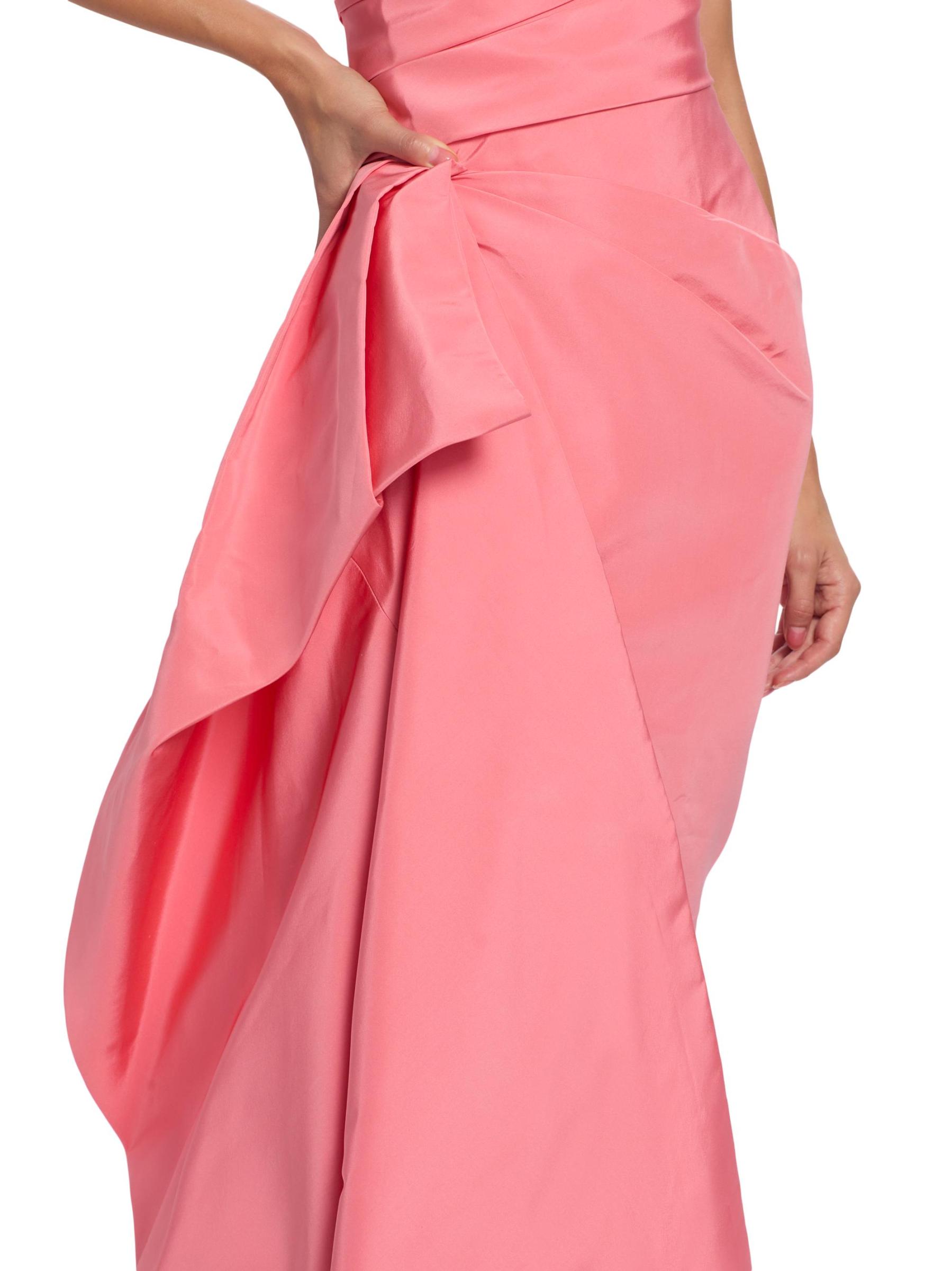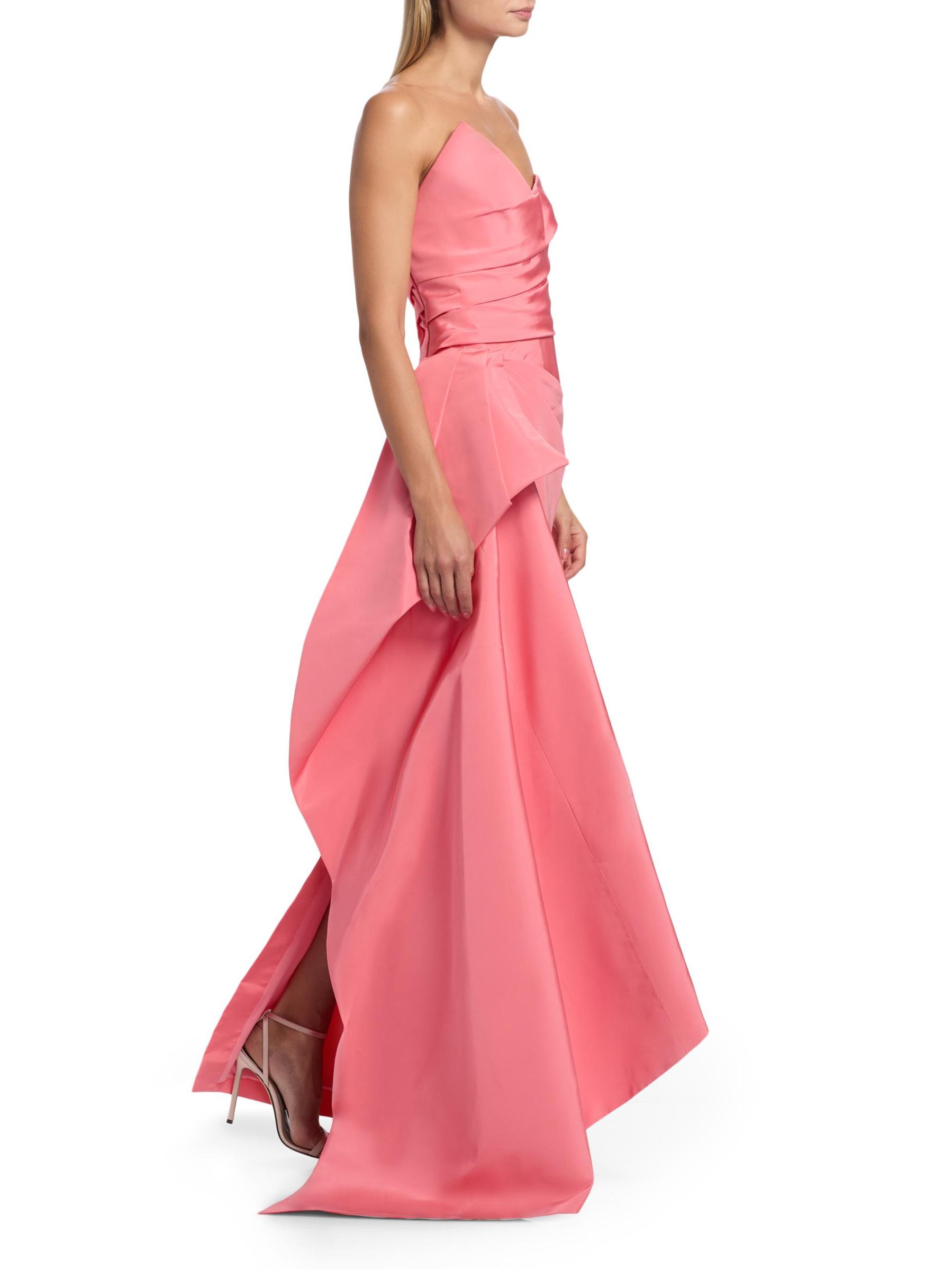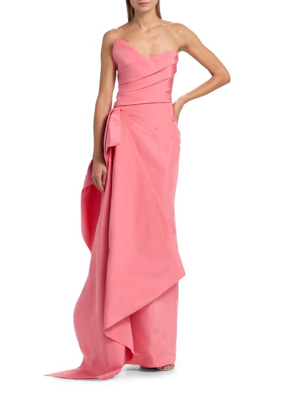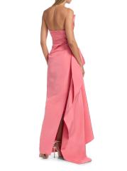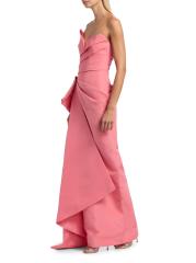 يتميز فستان Monique Lhuillier العمودي بدون حمالات والمصنوع من الحرير المهيكل والمصنوع من الحرير بتصميم منظم وصورة ظلية غير متماثلة وصدّار مطوي.