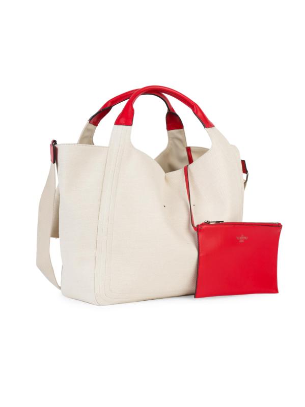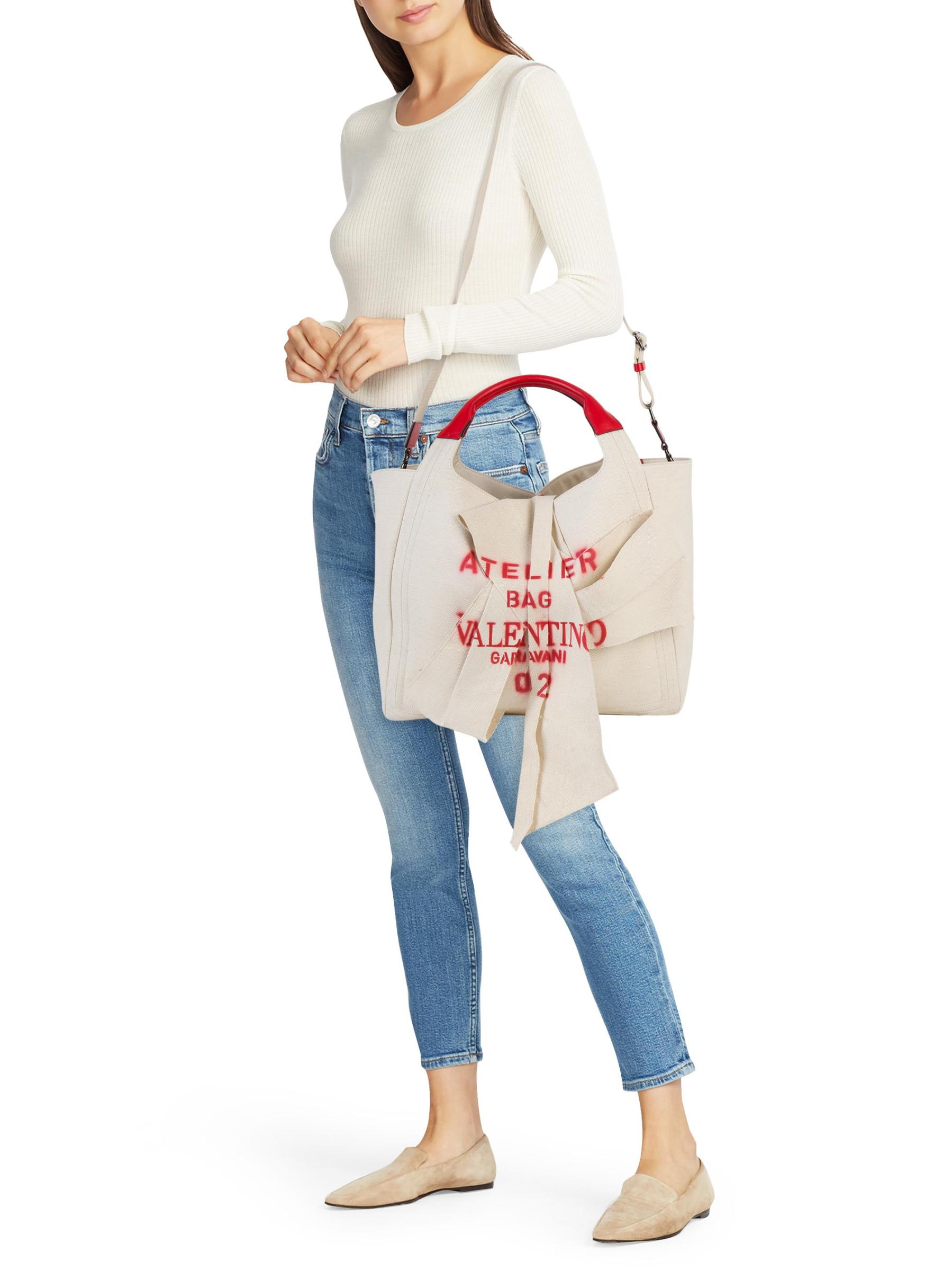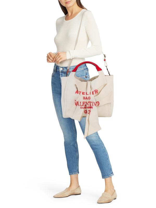 يمكن حمل هذه الحقيبة المصنوعة من القماش يدويًا أو ارتداؤها على الكتف، وذلك في صورة ظلية متهدلة مع تصميم فيونكة مطوية.