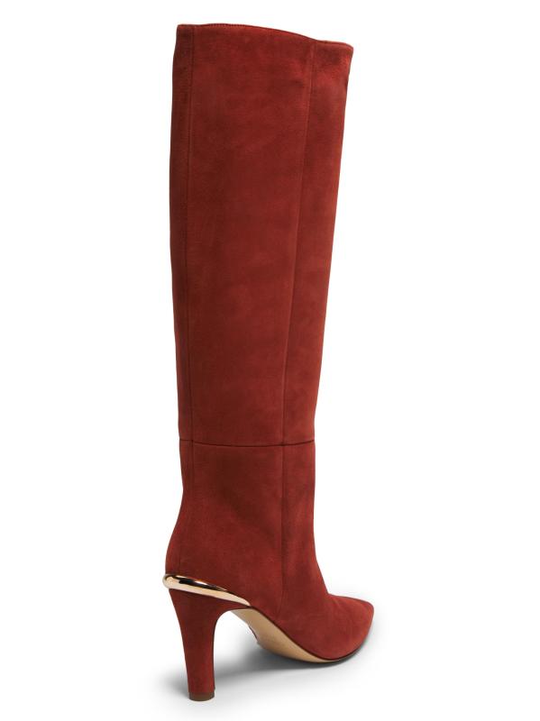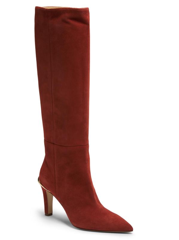 صُنعت أحذية Aura هذه من Gabriela Hearst من الجلد المدبوغ في شكل مدبب عند الأصابع، ومصممة لتصل إلى الركبة. تُفصِّل أجهزة Goldtone كعب هذا الطراز للحصول على لمسة نهائية لافتة للنظر.