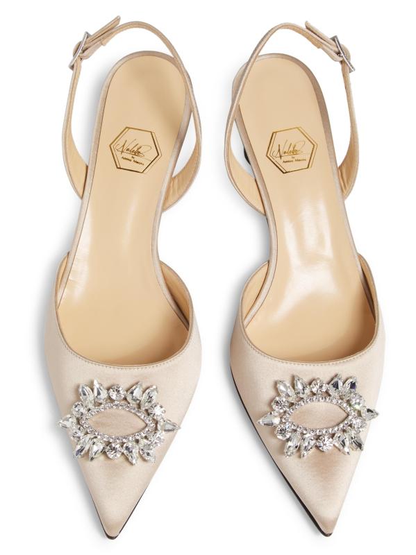حذاء Aurum slingback من Nalebe مصنوع من الساتان الفاخر مع كعب مزين بالكريستال ومقدمة مدببة.نقطة إصبع القدم إغلاق بمشبك الجزء العلوي من الساتان بطانة نسيجية نعل جلدي صُنع في إيطاليا
