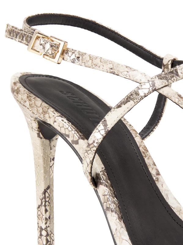 صُنع هذا الصندل الأزرق من Schutz من الجلد المنقوش على شكل ثعبان، ويتميز بكعب خنجر أنيق وإغلاق بإبزيم.