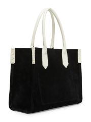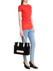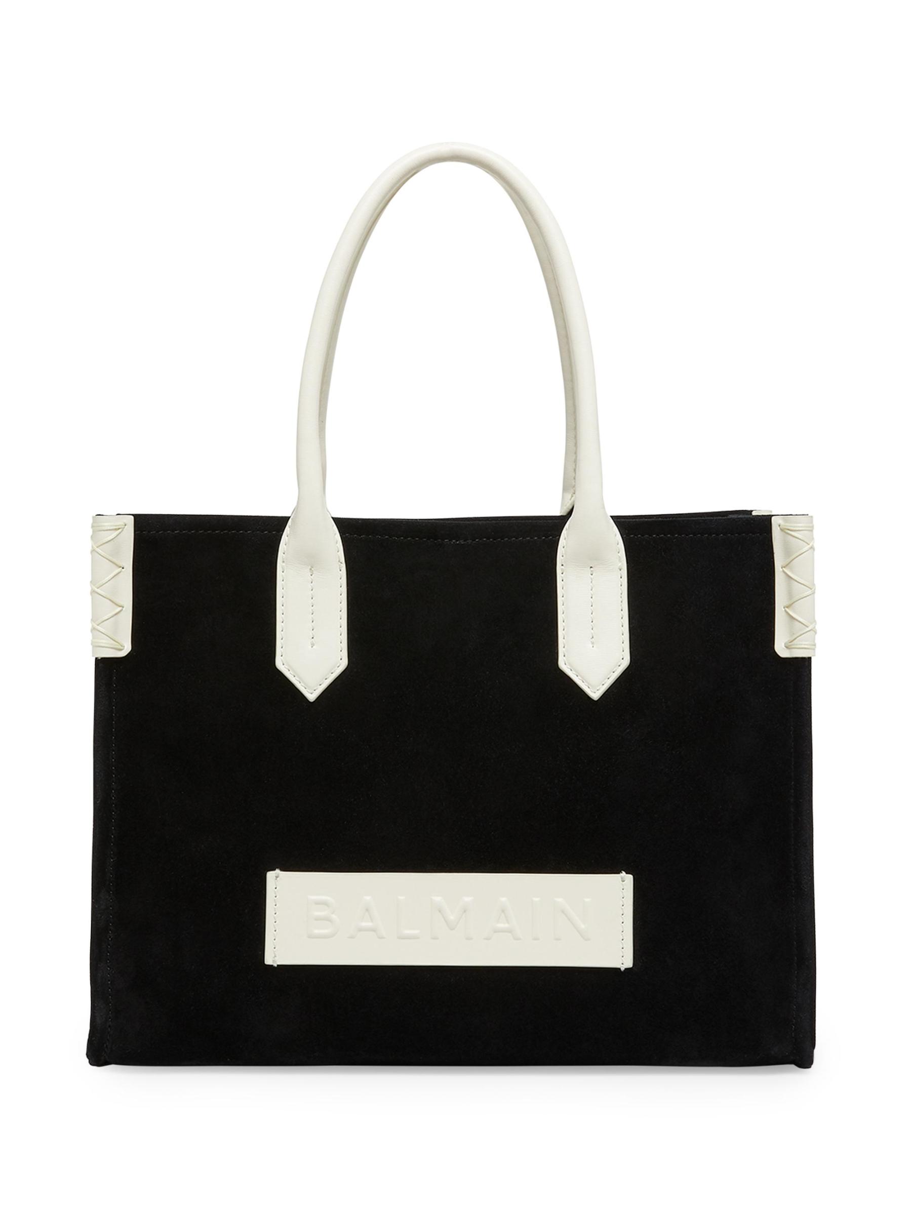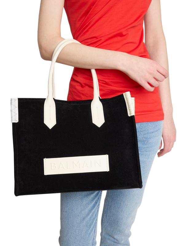 حقيبة B-Army من Balmain مصنوعة من الجلد المدبوغ الناعم مع زخرفة جلدية متباينة. تم تزيين التصميم برقعة منقوشة بشعار الماركة.مقبضان علويّان الجزء الداخلي: جيب واحد منزلق إغلاق بمشبك جلد سويدي الزخرفة: جلد صُنع في إيطاليا