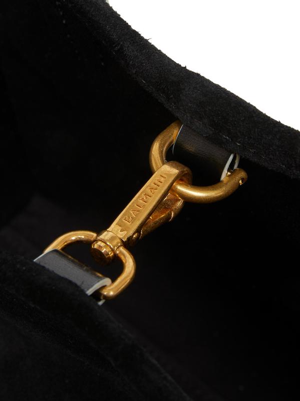 حقيبة B-Army من Balmain مصنوعة من الجلد المدبوغ الناعم مع زخرفة جلدية متباينة. تم تزيين التصميم برقعة منقوشة بشعار الماركة.