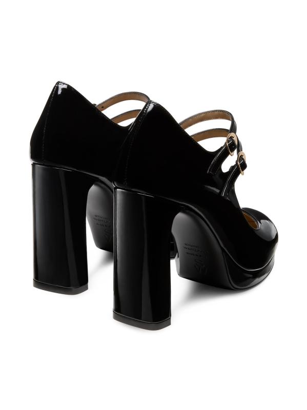 حذاء Babette من Stuart Weitzman مصنوع من الجلد اللامع، ويعرض صورة ماري جين. يكتمل هذا التصميم، الذي تم وضعه فوق منصة بكعب عريض مغطى، بحزامين مزوّدين بإبزيم.