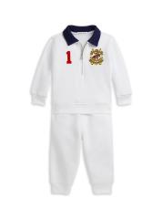 تتضمن مجموعة بولو رالف لورين المكونة من قطعتين والمصنوعة من مزيج القطن والصوف سترة بولو بنمط الرجبي بنصف سحّاب مع شعار الفروسية المطرّز على الصدر وبنطال رياضي متناسق.