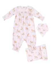تتميز مجموعة Little Fawn المكونة من ثلاث قطع من Angel Dear بمعطف رائع مطبوع بزخرفة مطرزة، بما في ذلك مريلة على شكل باندانا وبطانية ملفوفة.