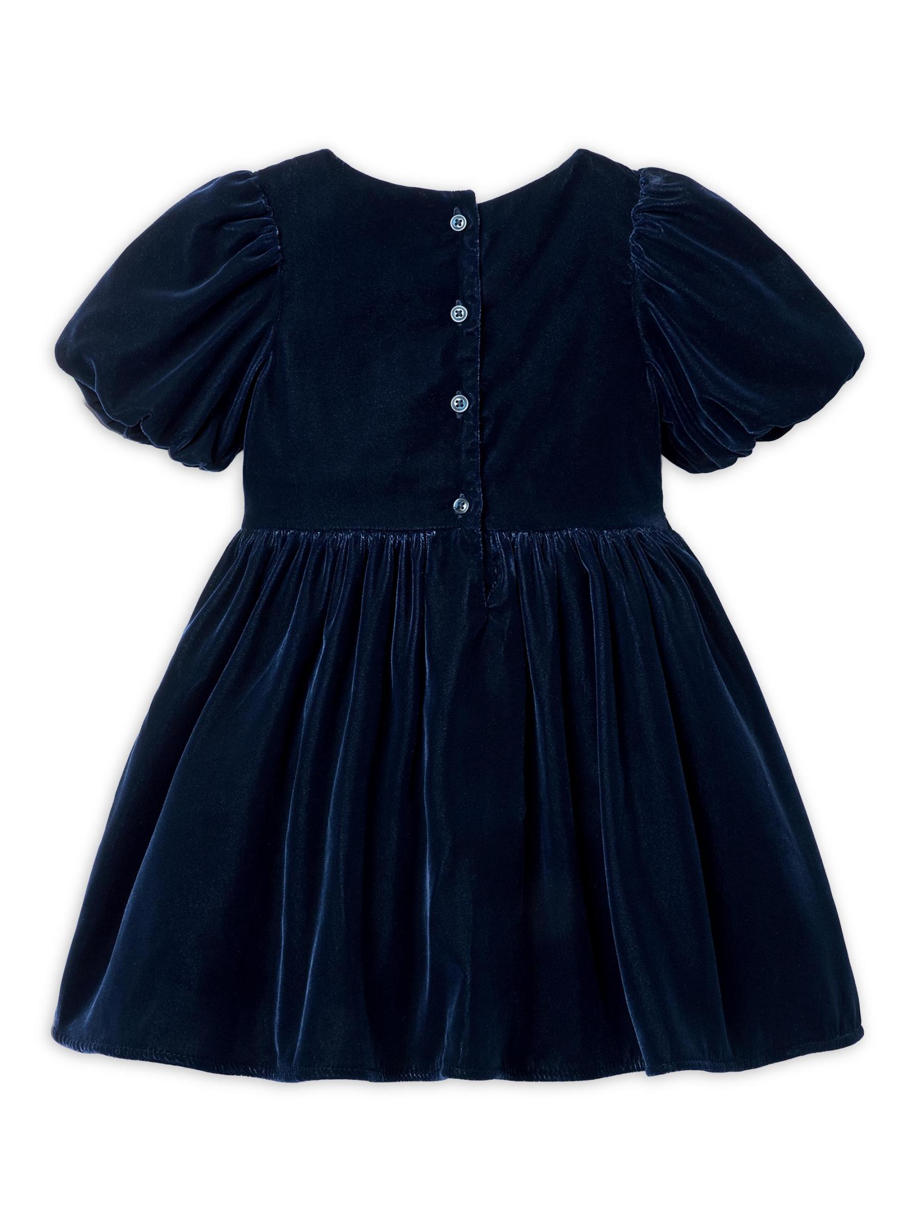 يتميّز هذا الفستان المخملي من Janie and Jack بتصميم على شكل حرف A بصف من الأقواس وأكمام منفوخة ساحرة.