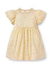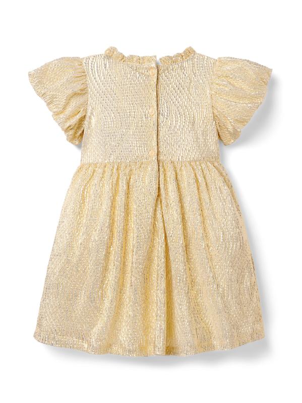 تم تصميم فستان Golden Moment من Janie and Jack في صورة بيبي دول بلمسة نهائية معدنية مزخرفة وأكمام منفوخة جميلة.