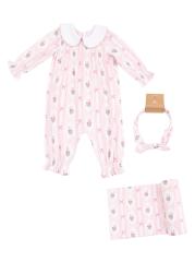 تتميز مجموعة Angel Dear's Ogee المكونة من ثلاث قطع والمزينة بنقشة الأزهار المستوحاة من الطراز القديم، بمعاطف مطرزة مع طوق رأس متناسق مزين بفيونكة وبطانية ملفوفة.