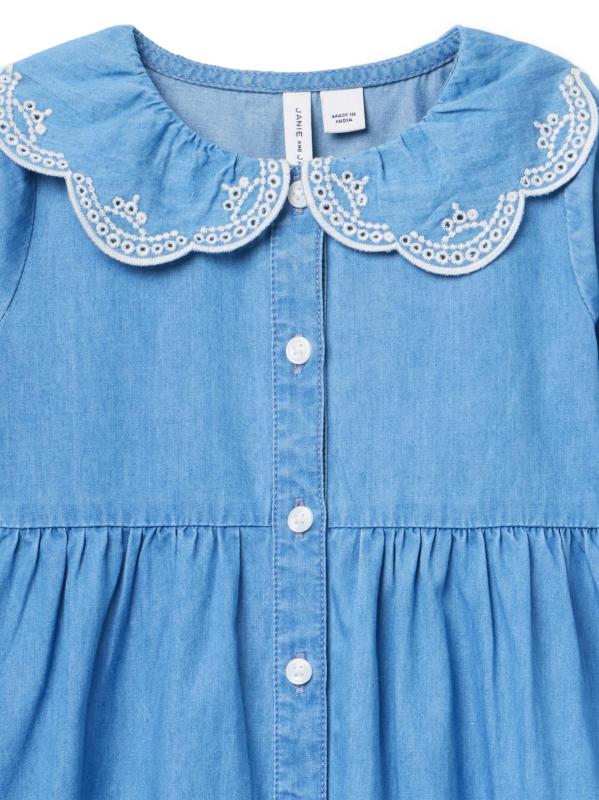 يتميز فستان Janie and Jack المزوّد بأزرار أمامية من القطن بتطريز على ياقة Peter Pan وأكمام بلوزة طويلة.