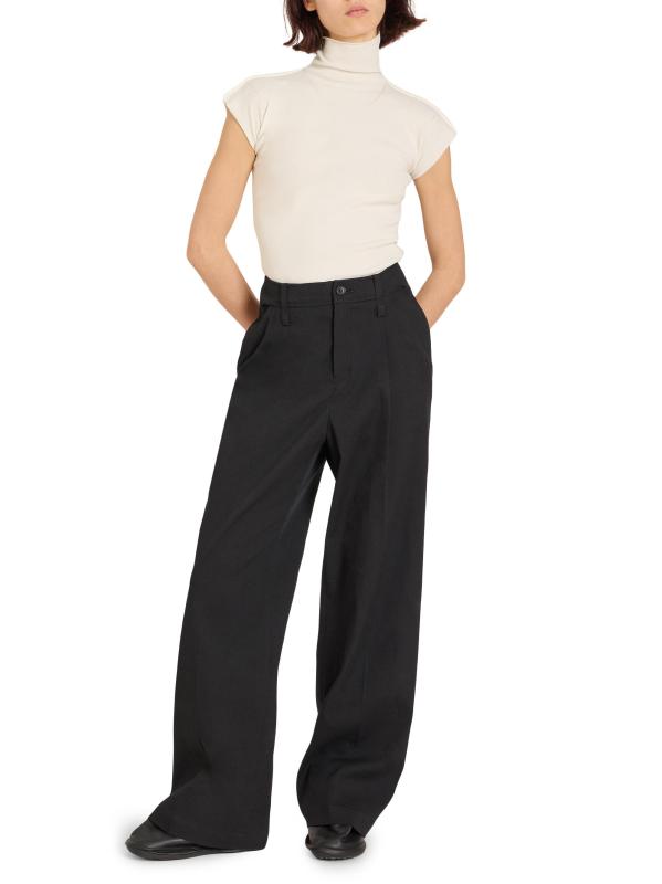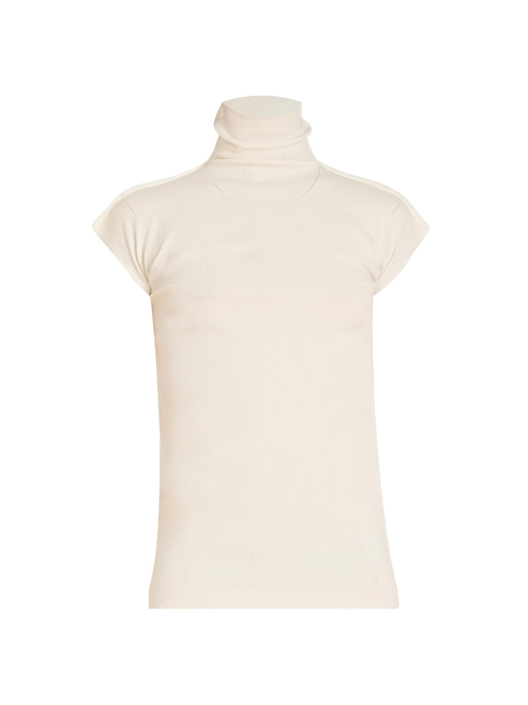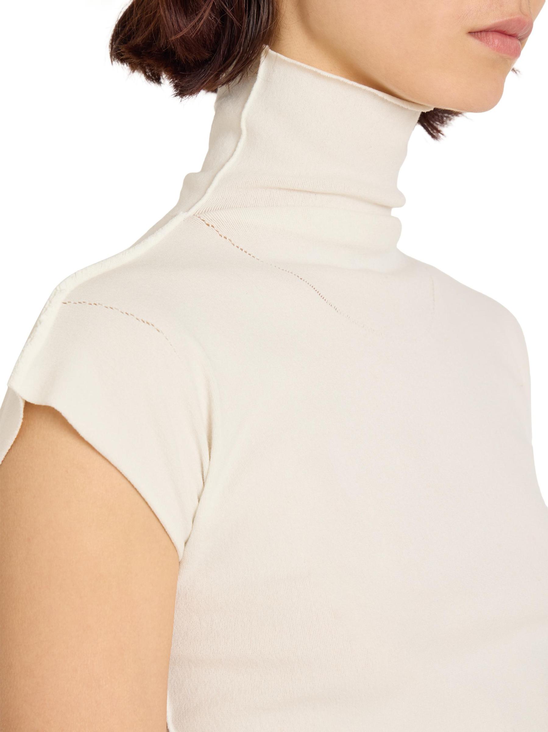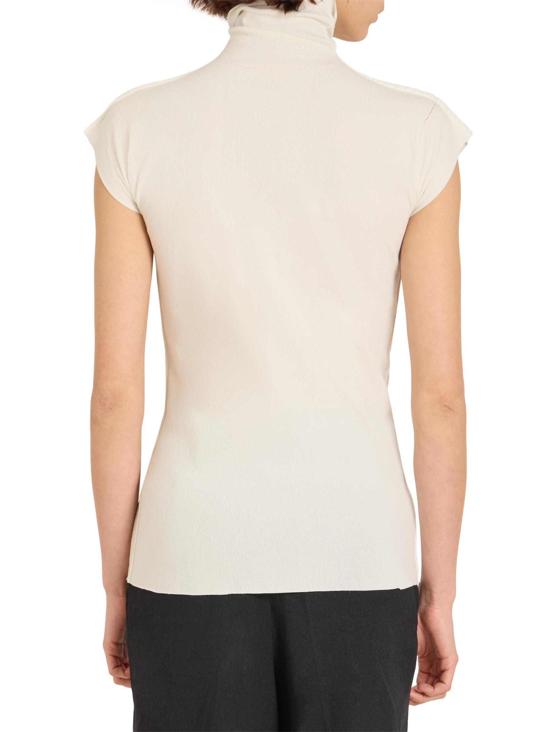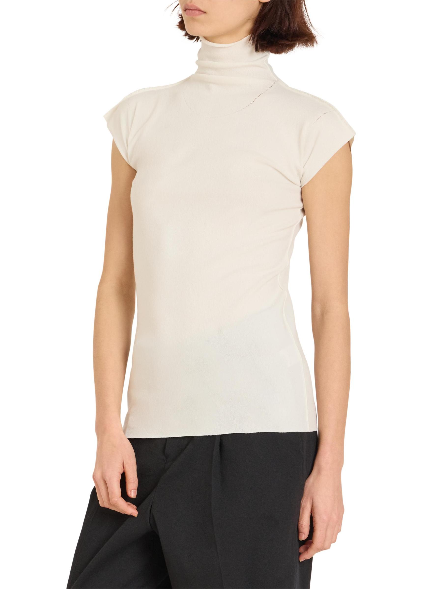 تتميّز بلوزة «باغيت» من إيسي مياكي بتصميم ضيّق مع تفاصيل حول الياقة المدورة المزيّنة ولمسات محبوكة.
