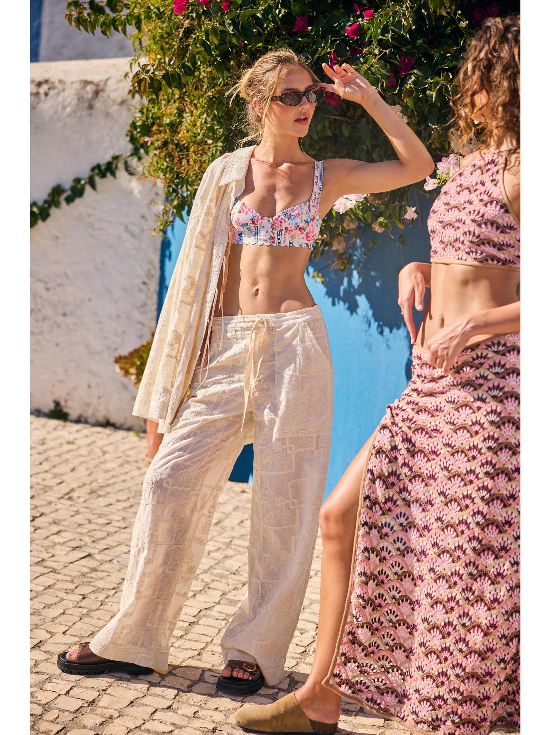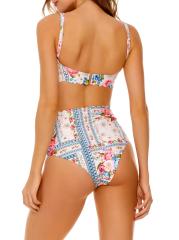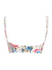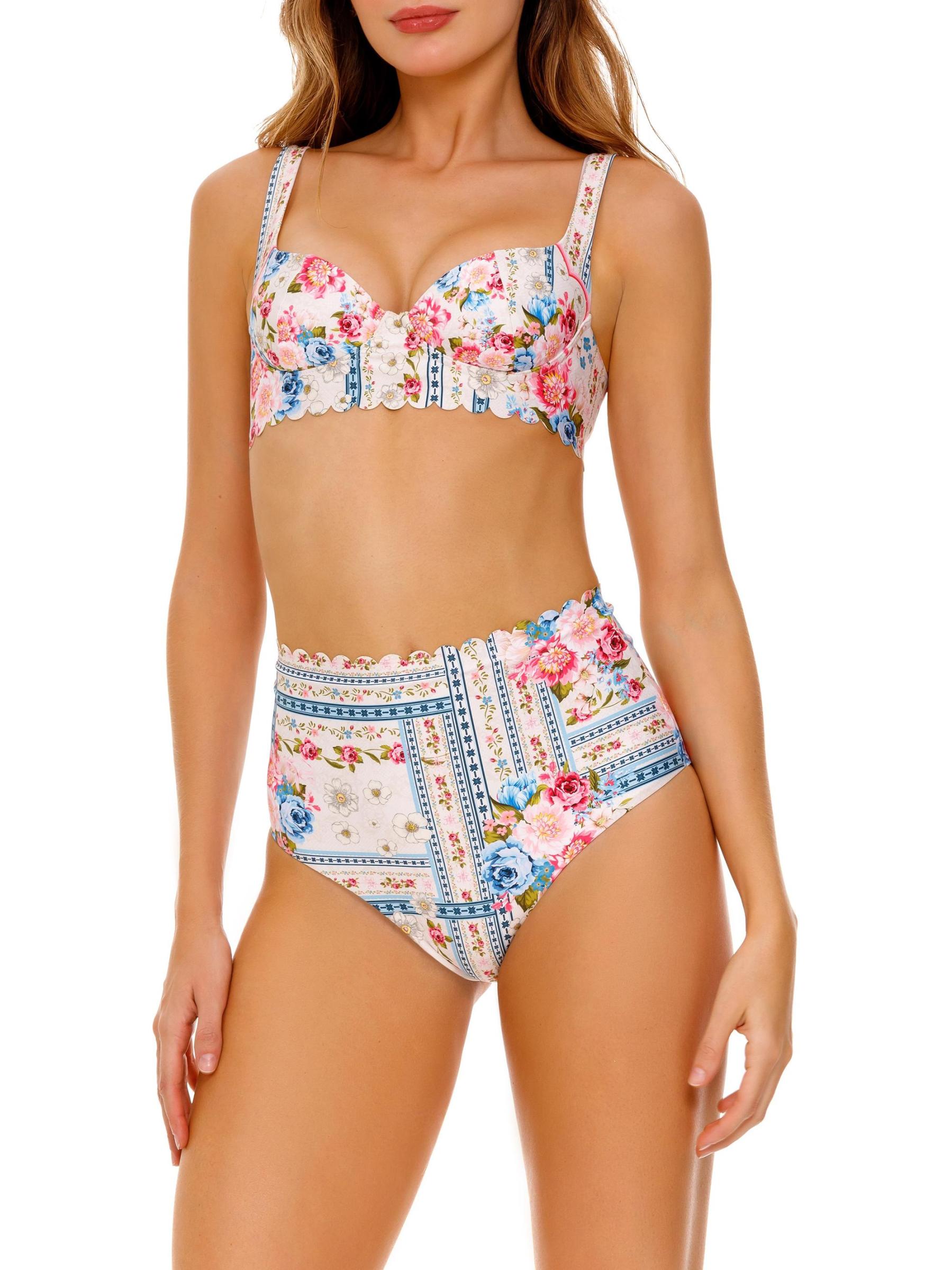 تتميّز بلوزة البكيني «بالينا ميراكي» المصنوعة من قماش مطاطي من أغوا بينديتا بنقشة الزهور وحافة صدفيّة.