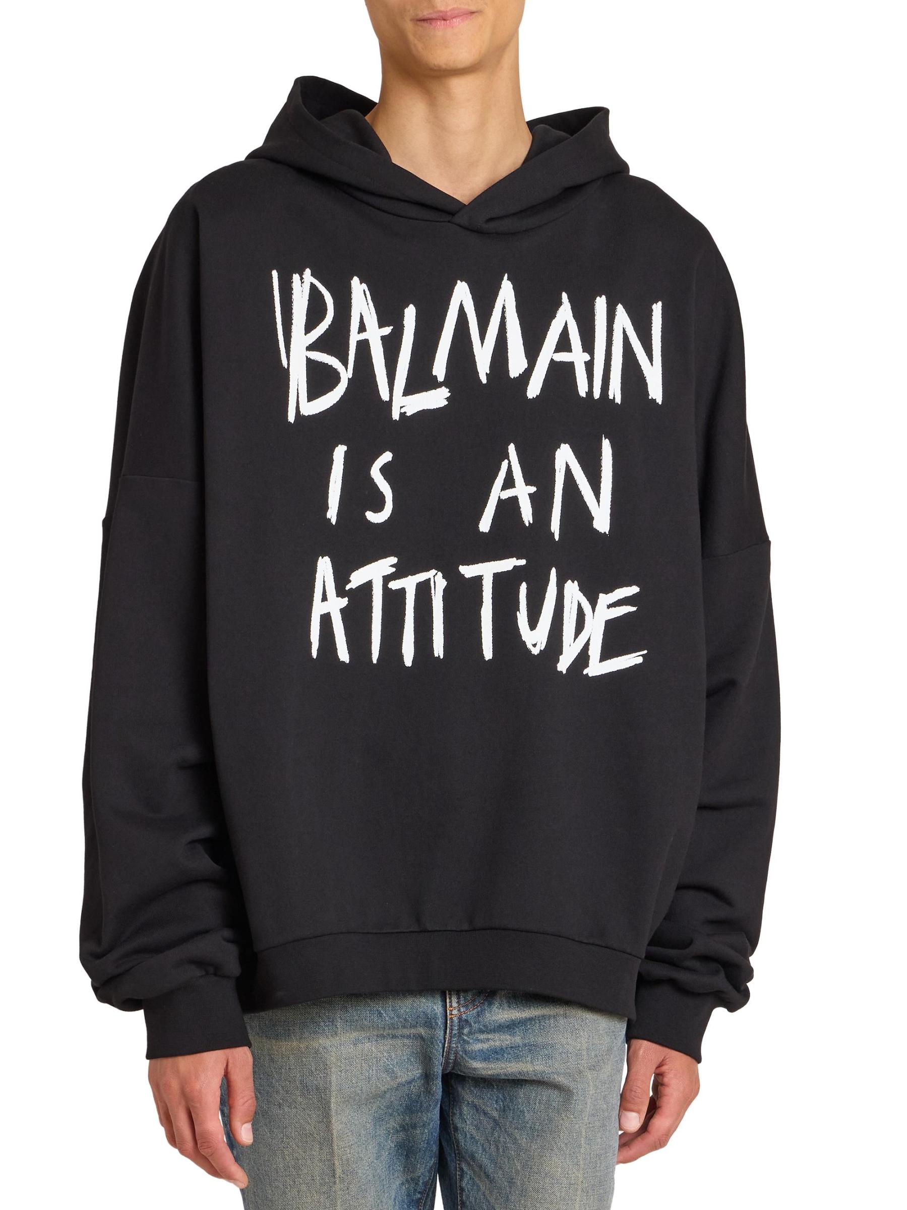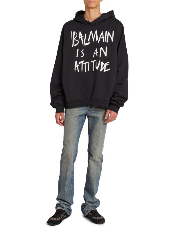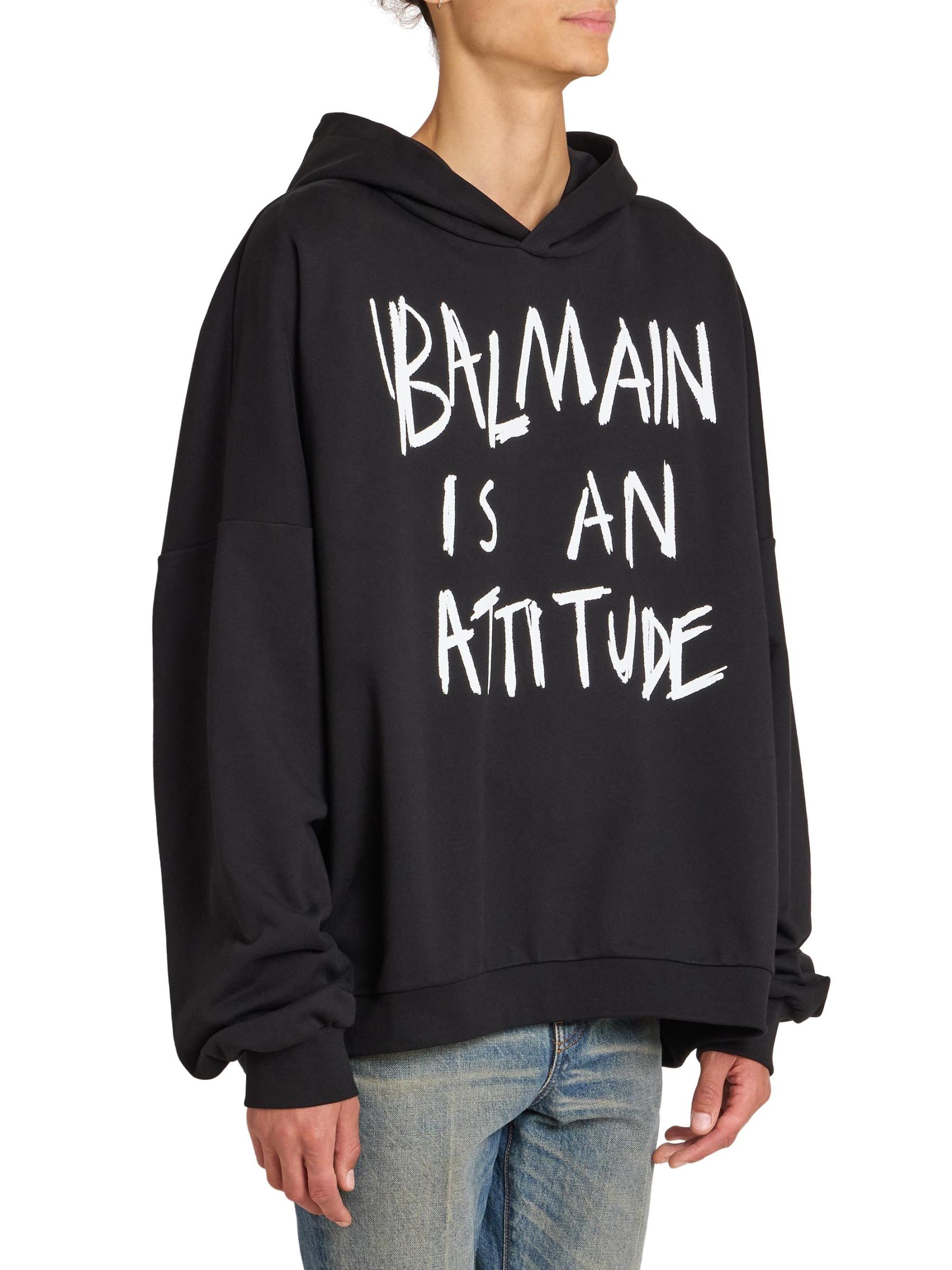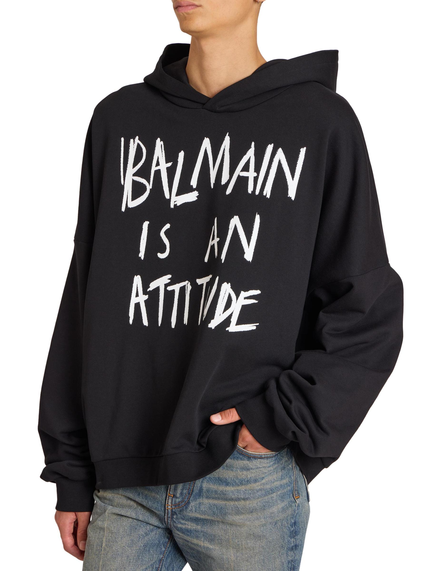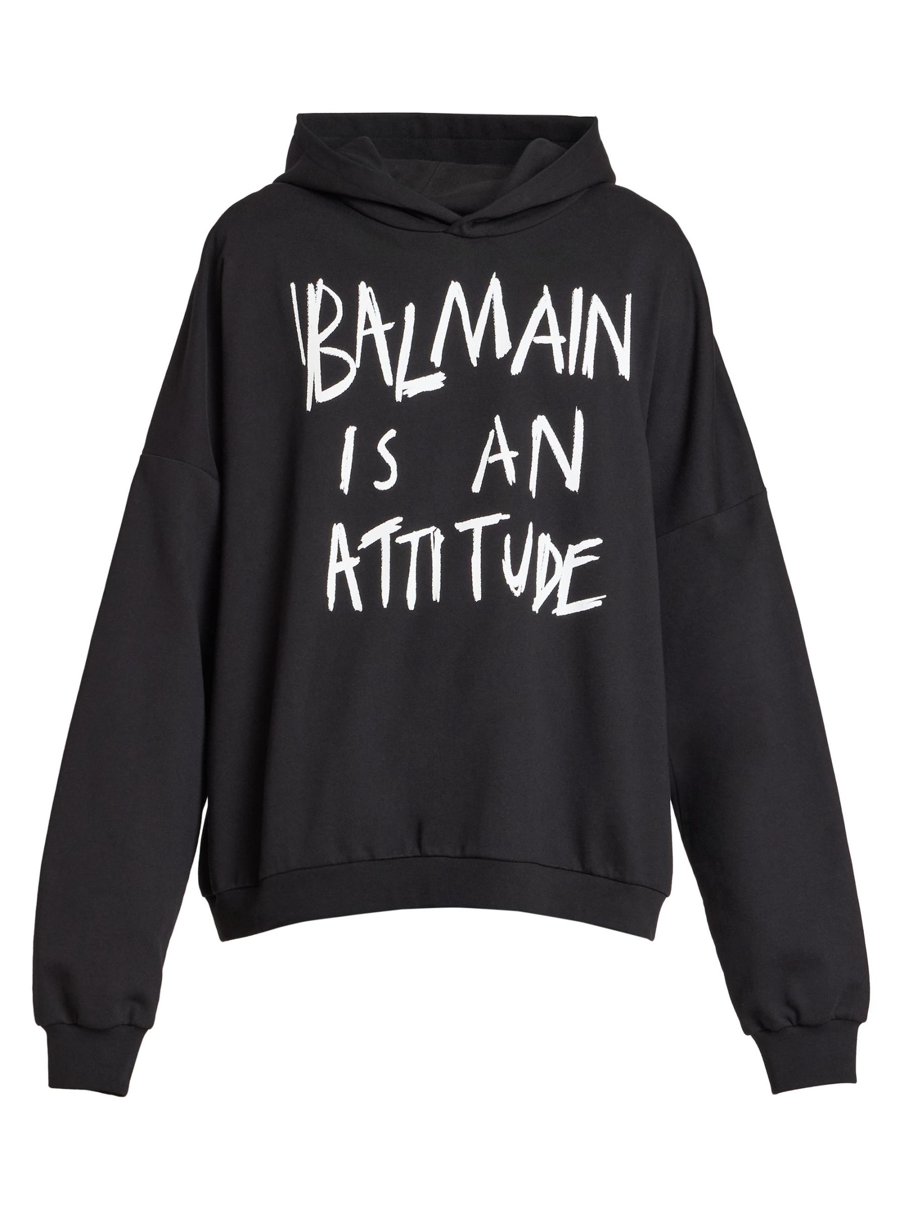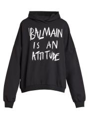 صُمم هذا الهودي المصنوع من القطن بعبارة «Balmain is a attitude» على الصدر.