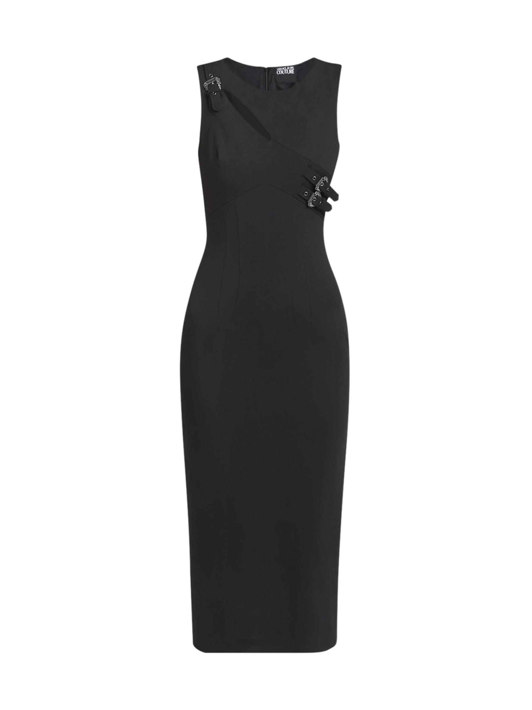 يتميز الفستان المتوسط المصنوع من الجيرسيه المرن من فيرساتشي جينز كوتور بتفاصيل مقصوصة عند الصدر وتفاصيل مشبك باروكي مميز.